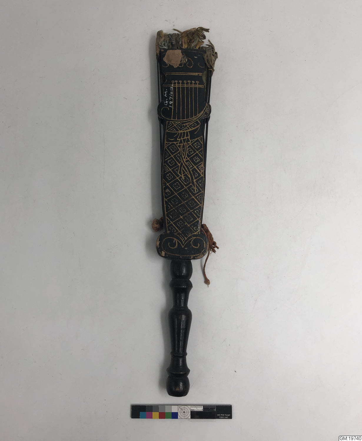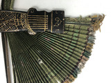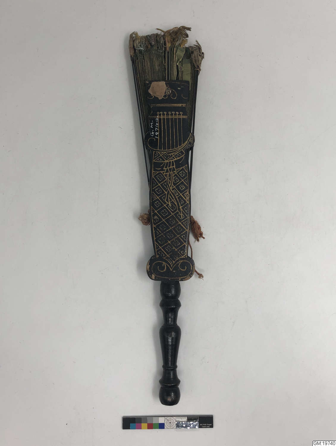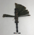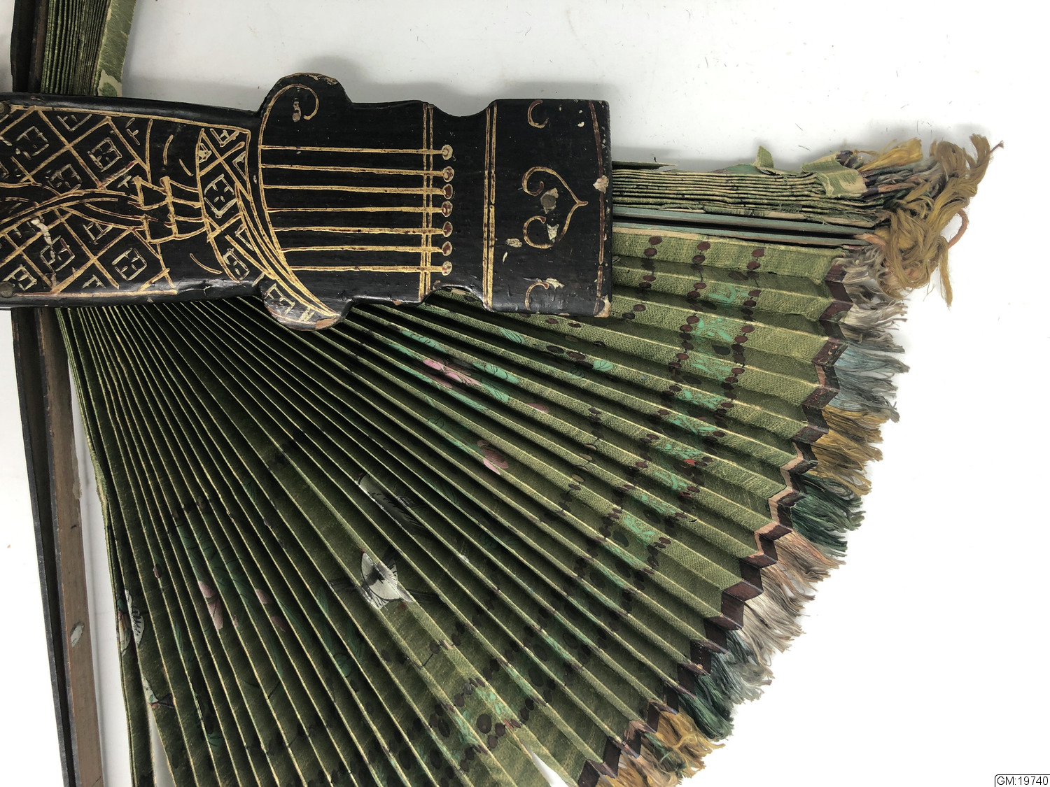 - Solfjäder med handtag i brunt trä med guldbemålning och utfällbar solfjäder i grönt papper bemålat med motiv av fåglar och insekter. Sidenfrans i ytterkanten. Solfjädern har en konstruktion där den veckade skärmen skjuts ut ur handtaget.