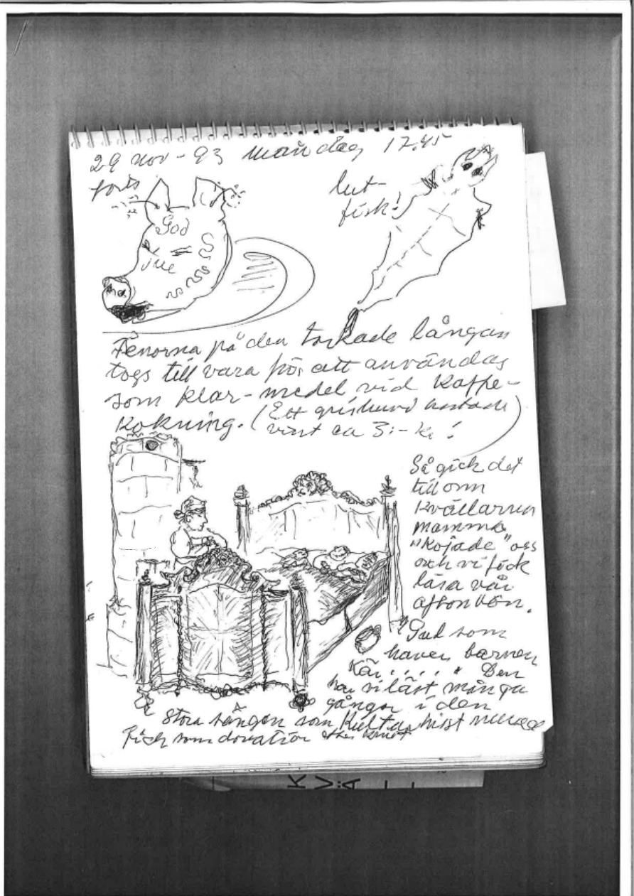 Utdrag (kopior) ur dagbok tillhörande Gert Möllers dagbok, rörande bl a den säng som tillhörde hans föräldrar och sedermera skänktes till Göteborgs historiska museum.