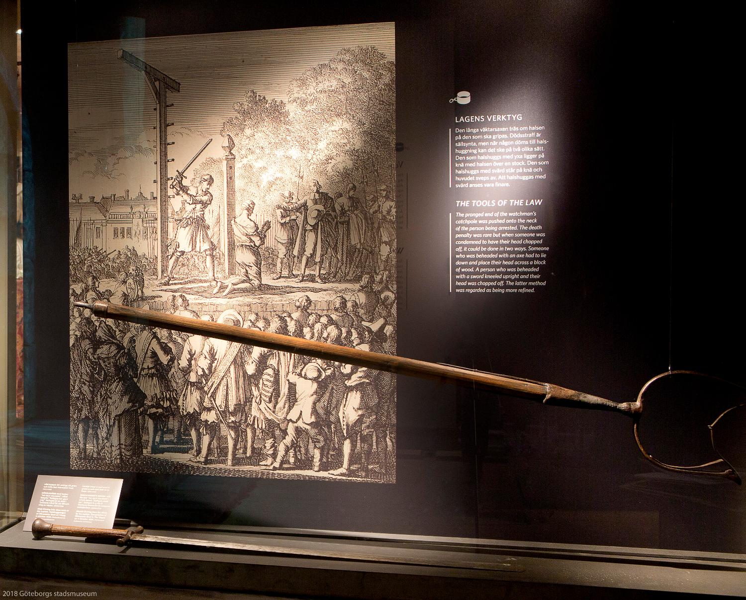 - Den långa väktarsaxen träs om halsen på den som ska gripas. Dödsstraff är sällsynta, men när någon döms till halshuggning kan det ske på två olika sätt. den som halshuggs med yxa ligger på knä med halsen över en stock. Den som halshuggs med svärd står på knä och huvudet sveps av. Att halshuggas med svärd anses finare.