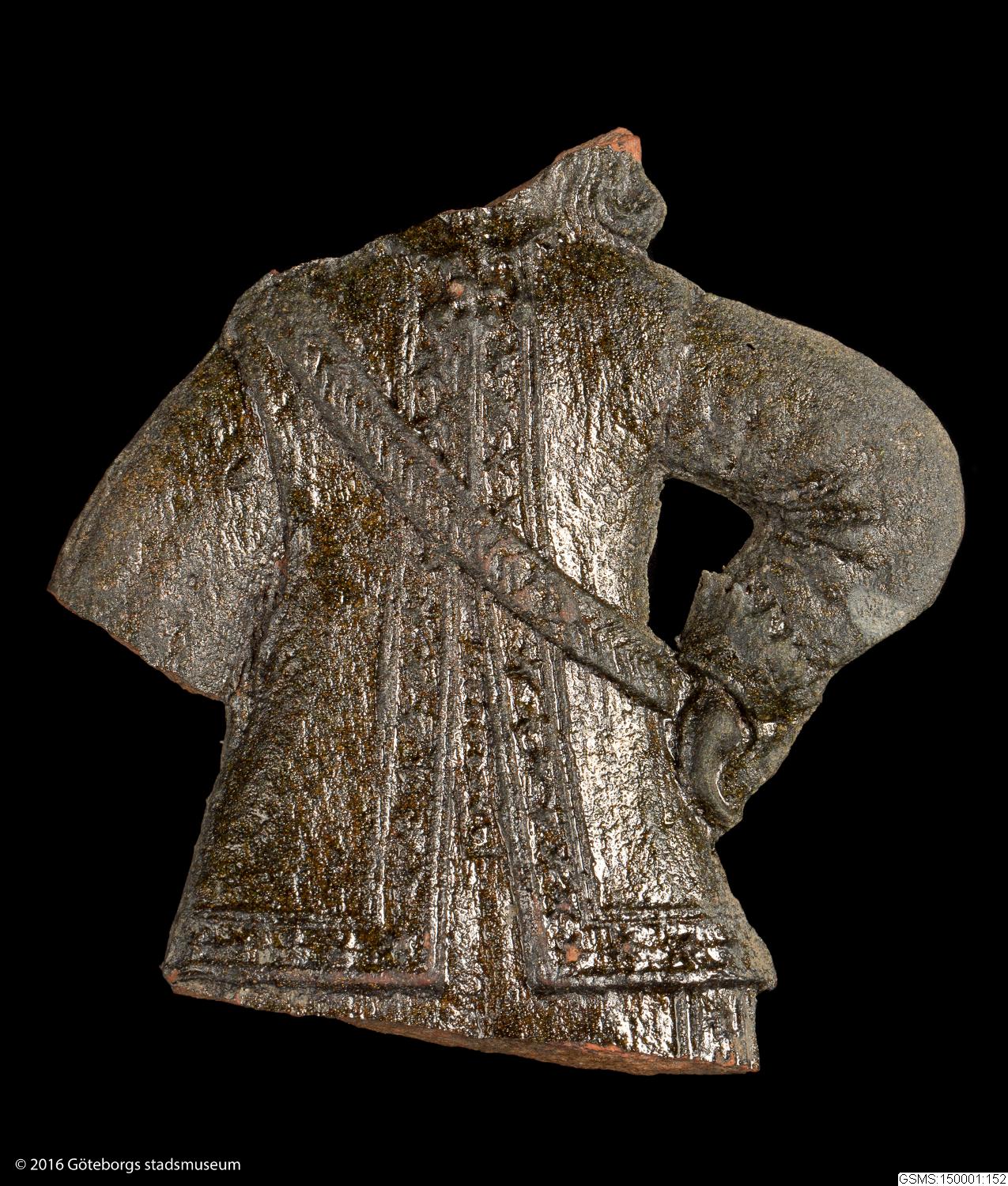 Figurin av keramik från 1600-talet. Hittades år 2015 av arkeologer under ett hus vid Gustav Adolfs torg i Göteborg. (GSMS:150001:1) [Göteborgs födelse, 2017]