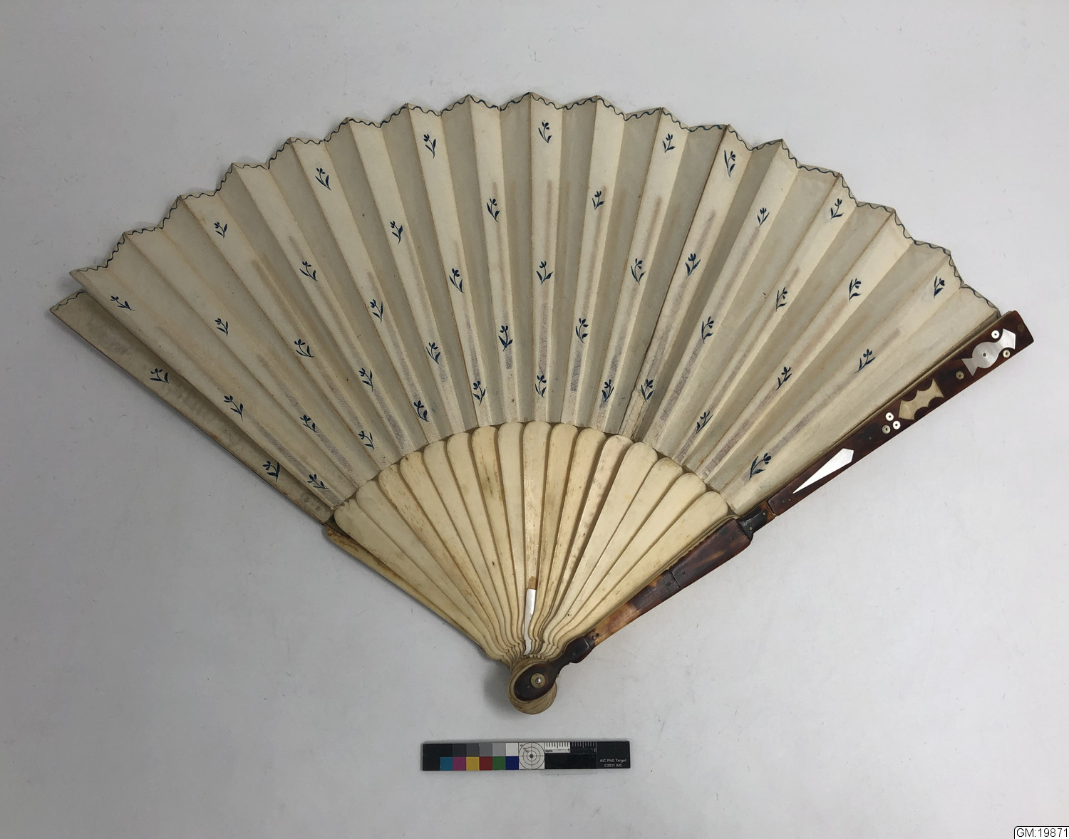 Solfjäder med spröt i elfenben överdragna med papper bemålade med små blå blommer. De yttre skalmarna har iläggningar av sköldpadd och pärlemor.