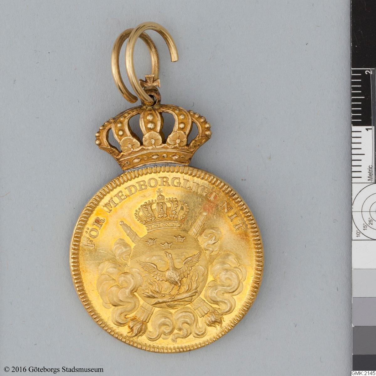 Beskrivning: Allmänna brandförsäkrings direktionens belöningsmedalj i guld försedd med kunglig krona och bärögla fäst i kronan, Konung Karl XIV Johans porträtt på framsidan samt runt medaljens kant Konungens namn och titel, baksidan visar Barndstodsbolagets sinnebild, Fågel Fenix som reser sig ur lågorna samt inskriften För Medborgerligt Nit. Tilldelad skeppsfurneraren Gustaf Melin, f. 1776 d. 1828, vilken erhöll medaljen år 1822, efter stora Stigbergsbranden 1821, där han fick sina ben så svårt skadade att han aldrig blev återställd. Skänkt till museet av änkefru Carolina Melin f. Lundberg.