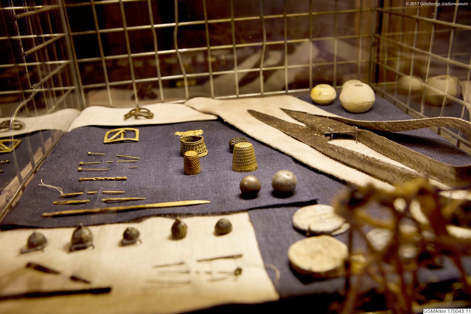 - Idag är nästan alla kläder från Nya Lödöse borta. Kvar finns ullsaxen som fåren klipps med och sländtrissan från sländan som används till att spinna garn av ullen. Synålen finns kvar och fingerborgen som skyddar fingertoppen när du syr, och knappar, spännen och kedjebältet som suttit på kläderna. Några blymärken ser ut som mynt, de sitter på dyra rullar med importerat tyg. Märkningen visar var tyget kommer ifrån.