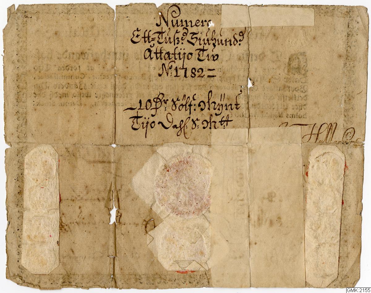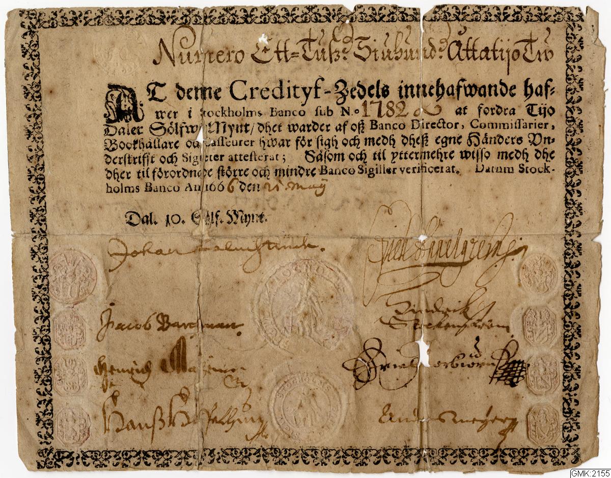 Beskrivning: Sedel av papper med vallören 10 Daler silvermynt från år 1666. Utfärdad av Stockholm Banco, en av de första sedlar som utgavs i Sverige, åren före Sveriges Riksbanks grundande år 1668. På framsidan finns följande text, i en modernare översättning: Att denna kreditivsedels innehavare har i Stockholms Banco, nr 1782, att fordra 10 daler Silvermynt, det varder av oss Banco Dierktör, Commissionärer, Bokhållare och Cassörer var för sig och med dess egna händers underskrivande och Sigiller attesterat. Såsom och till yttermera visso med de därtill förordnade större och mindre bancosigiller verifierat. Datum Stockholm Banco Anno 1666 den 25 maij.