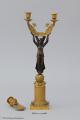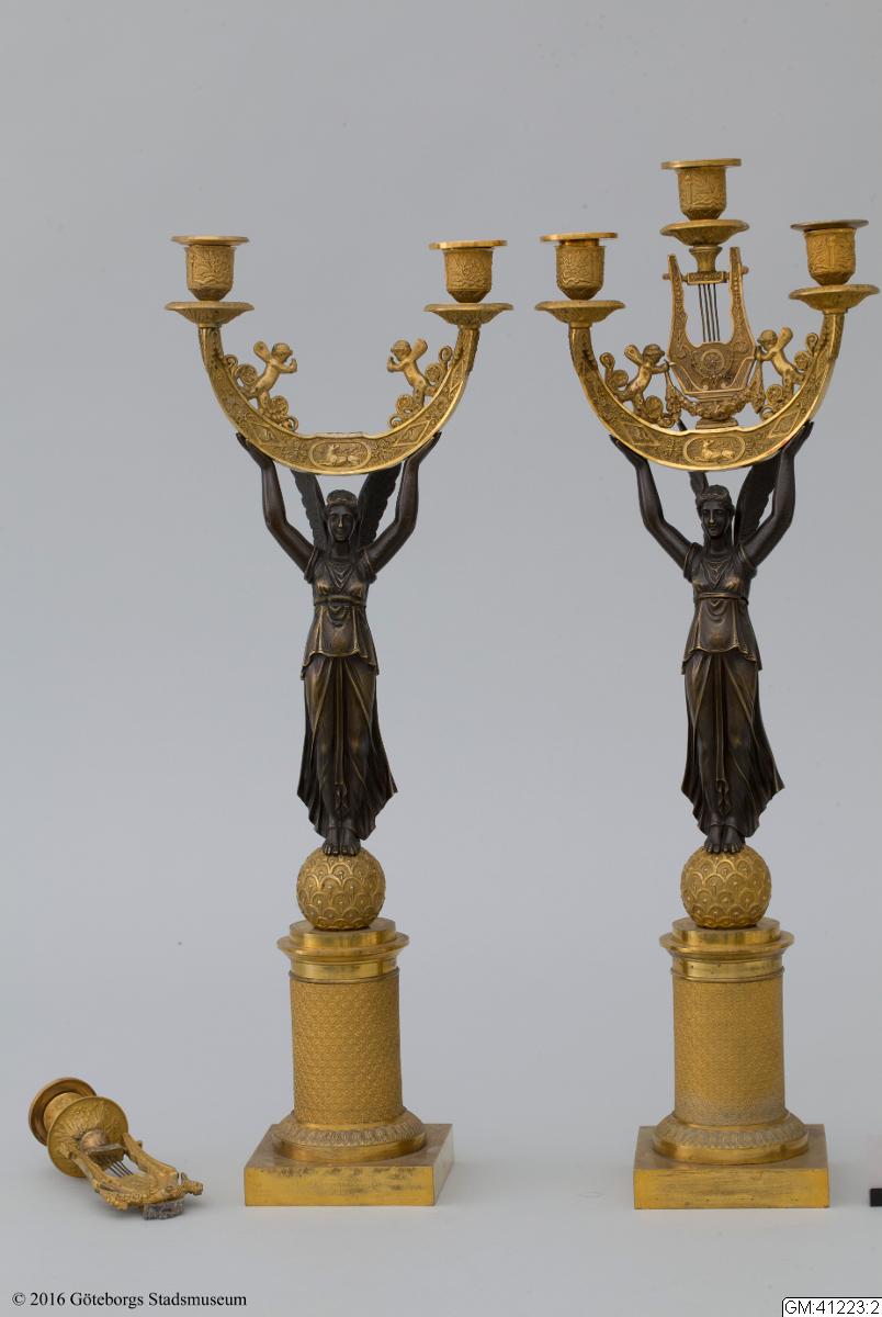 Beskrivning: Ett par kandelabrar av brännförgylld brons som tillverkats ca 1820-30. Kandelabrarna är för tre ljus och består av en brännförgylld kolonnfot som är kvadratisk, ovanpå kollonnen är ett förgyllt klot placerat, en bronspatinerad bevingad kvinna i antik dräkt bär upp de tre ljuspiporna som är monterade i ett bågformigt brännförgyllt dekorerat krön med lyra, putti ( i konsten vanligt förekommande små nakna barngestalter) och bladornament samt girlanger. GM:41223