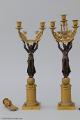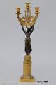 Beskrivning: Ett par kandelabrar av brännförgylld brons som tillverkats ca 1820-30. Kandelabrarna är för tre ljus och består av en brännförgylld kolonnfot som är kvadratisk, ovanpå kollonnen är ett förgyllt klot placerat, en bronspatinerad bevingad kvinna i antik dräkt bär upp de tre ljuspiporna som är monterade i ett bågformigt brännförgyllt dekorerat krön med lyra, putti ( i konsten vanligt förekommande små nakna barngestalter) och bladornament samt girlanger. GM:41223