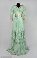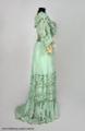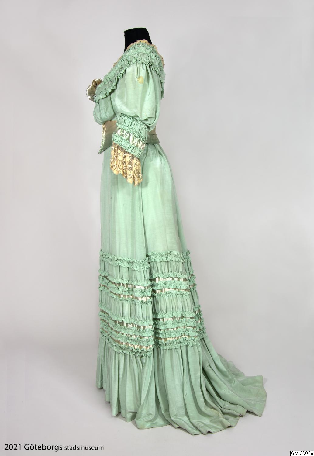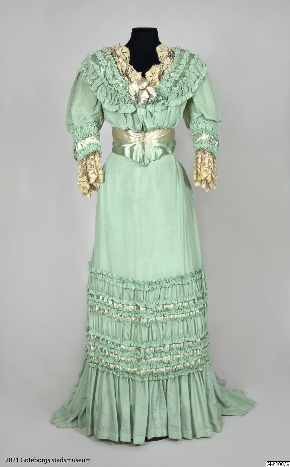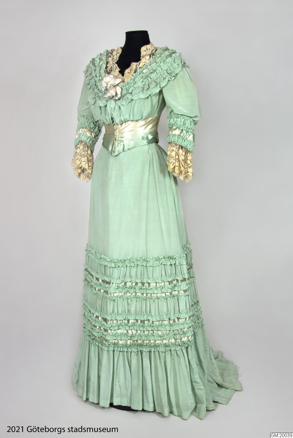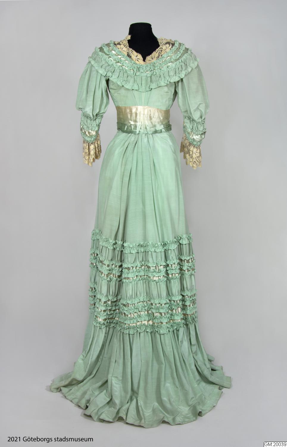 Klänning av ljusgrönt sidenrips med garnering av dito siden samt spetsar.