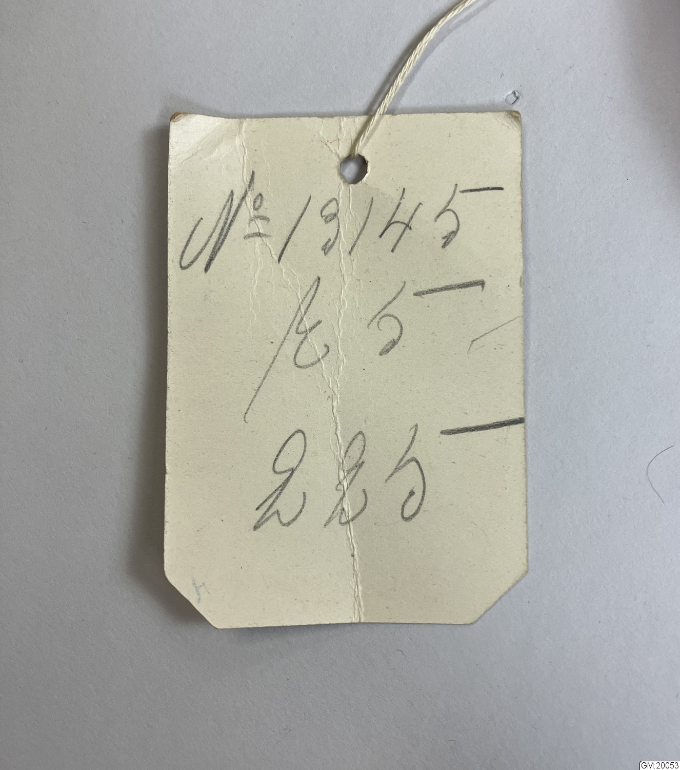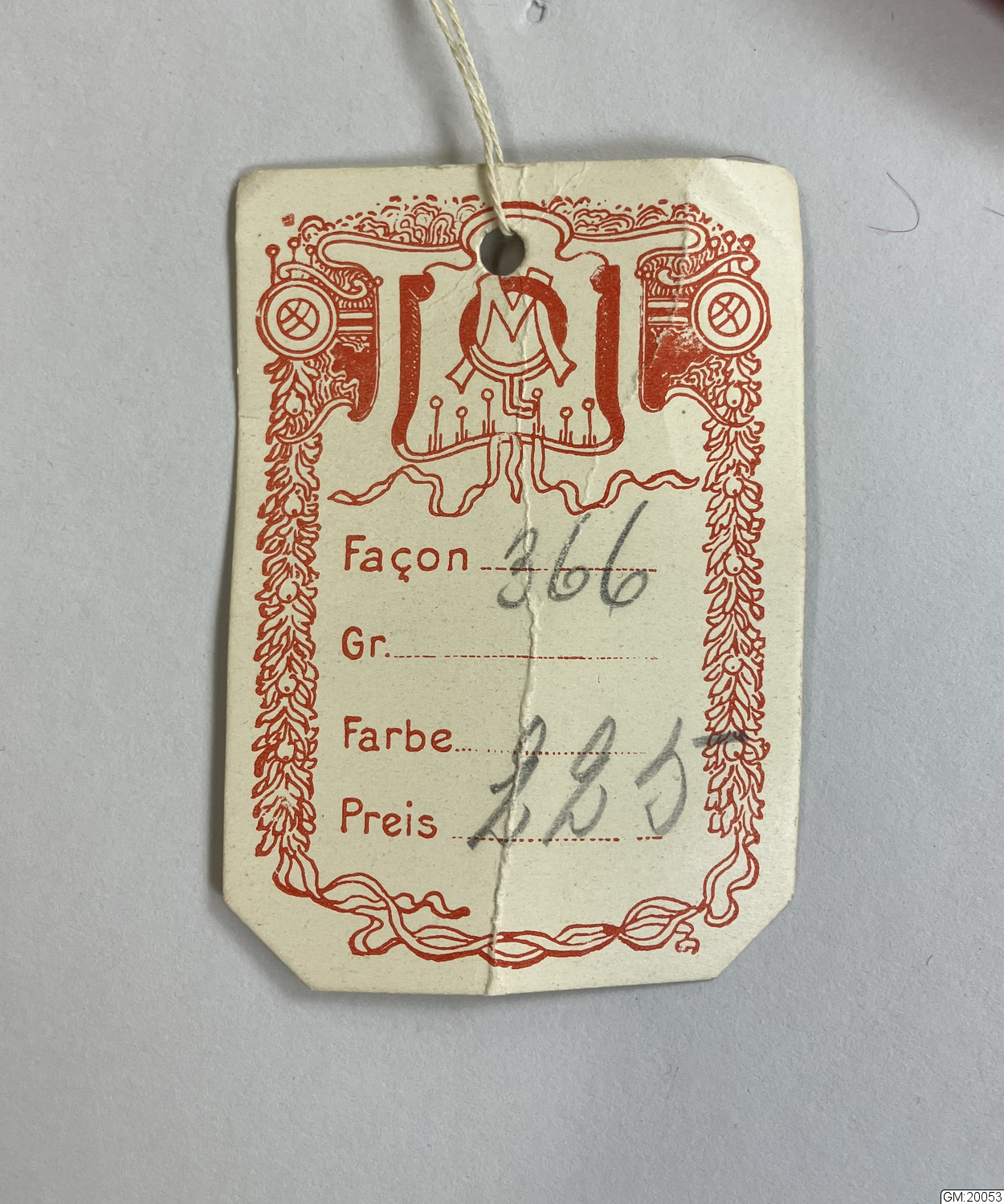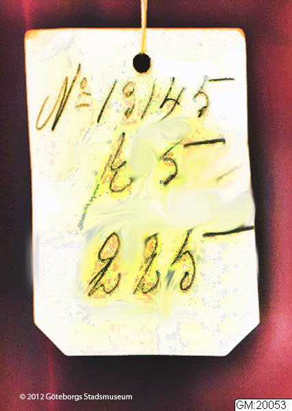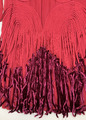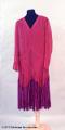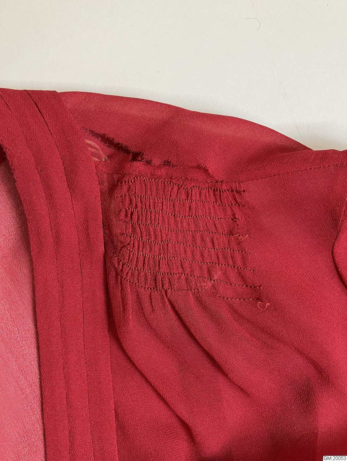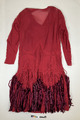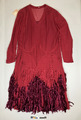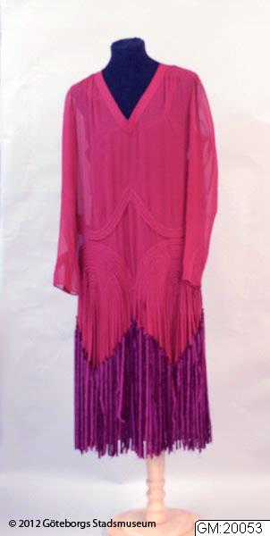 Klänning av röd chiffong, långärmad rak modell med dekorveck och silkesniljefransar nedtill. Underklänning av röd crêpe de chine, fastsydd i axelsömmen. Dateringen gjord med hjälp av tidskrifterna Weldons Ladies Journal 1926 samt Tres Parisienne 1926.