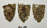 Fyra delar från en kollekthåv. består av sillke, metalltråd och paljetter på en botten av sidentyg.