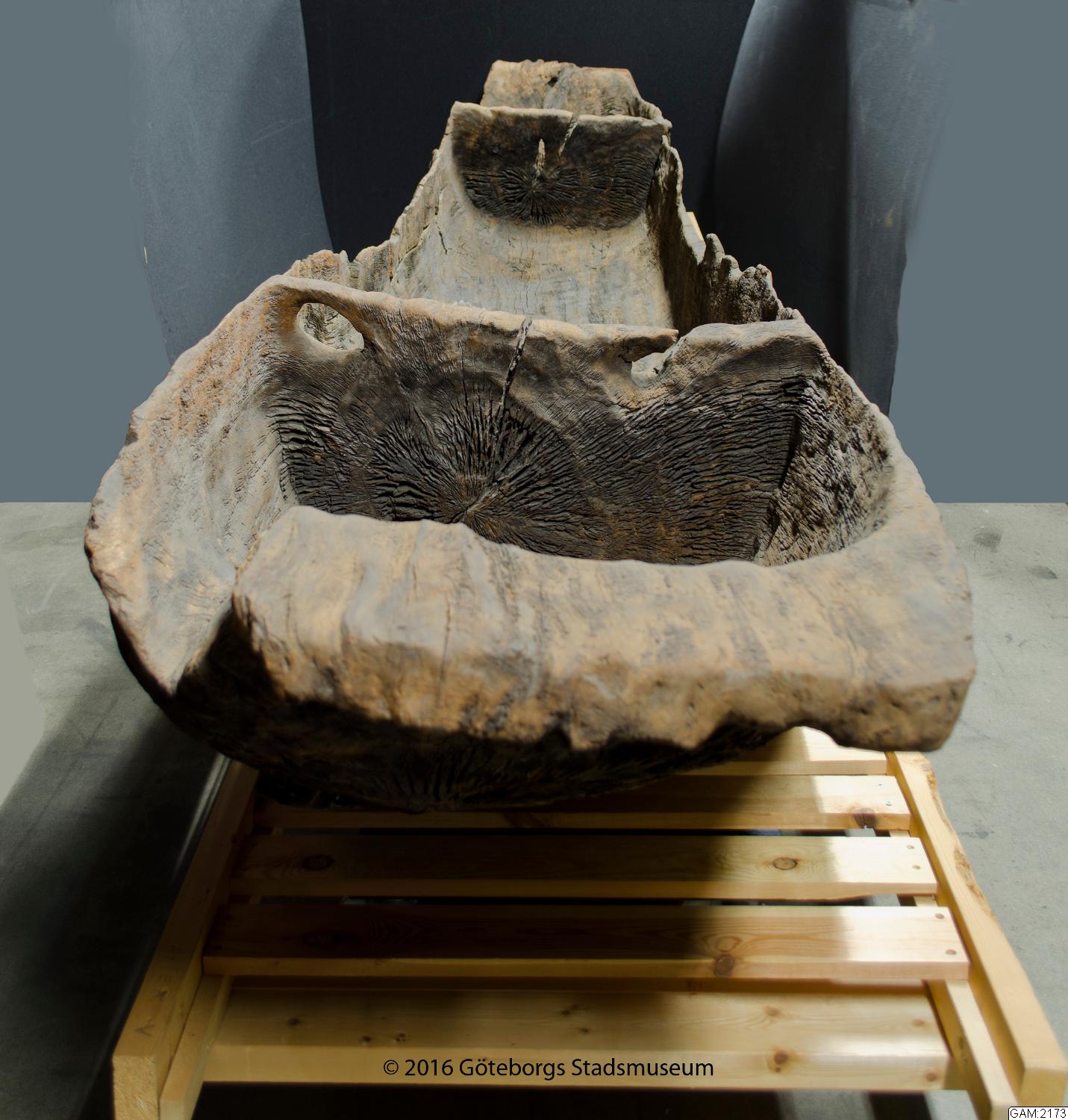 Funnen på botten av en mosse vid Ottersjö. Båten har två tvärväggar i ett stycke. fördelade i tre rum