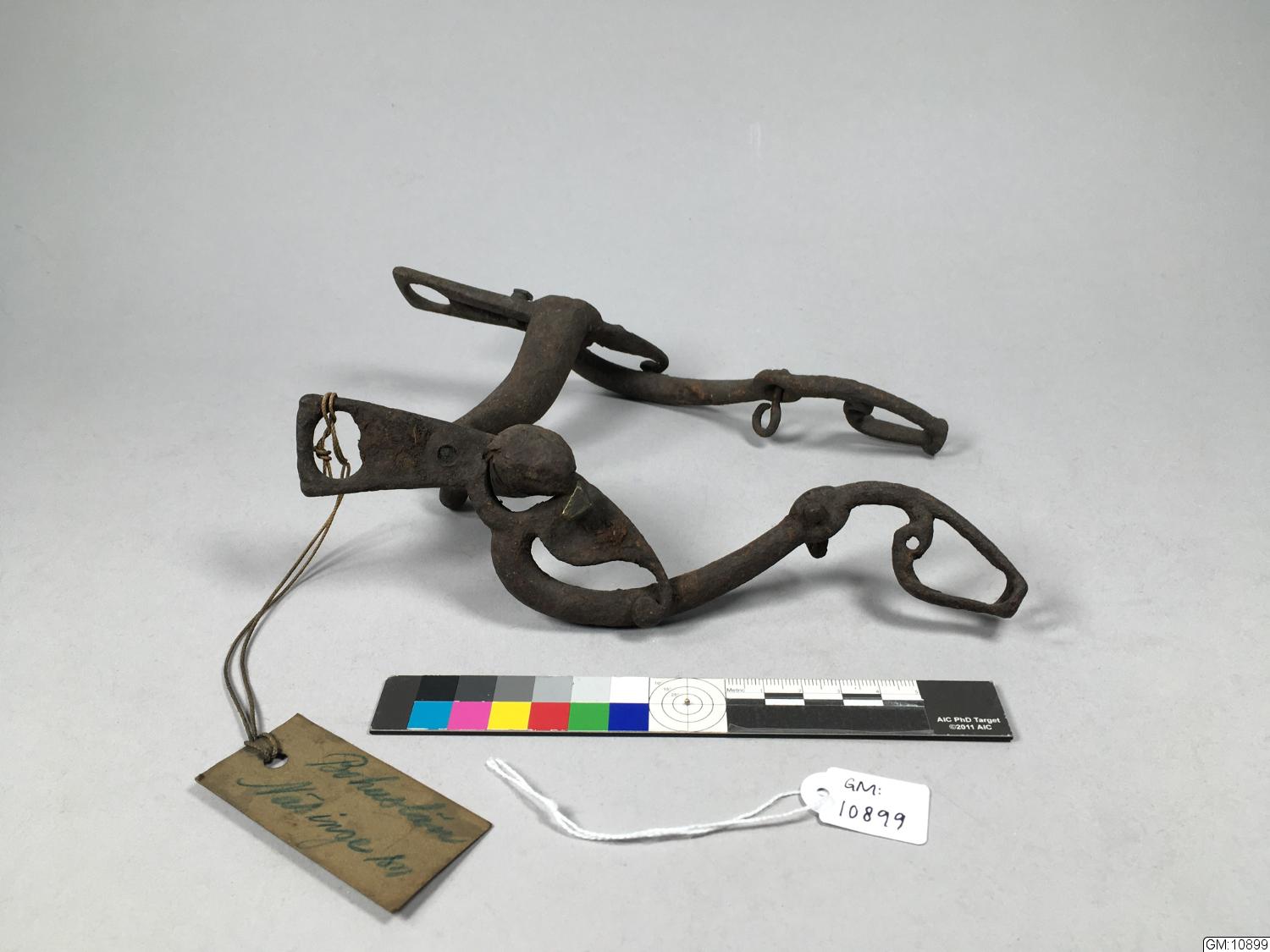 Enligt liggaren: "Betsel av järn med naglar av mässing. Funnet i jorden och enligt uppgift från Karl XII tid."