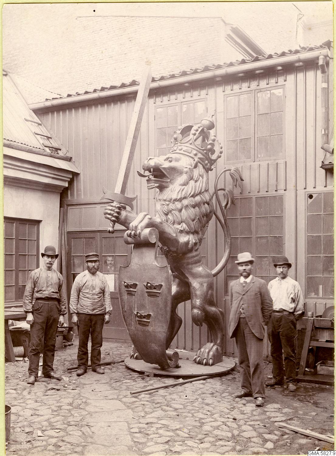 Krönet till Skansen Lejonet på Bleck- & Plåtslageribolagets gård, Sillgatan 7. På ömse sidor om lejonet står Simon Olsson i ljus hatt och kostym med arbetarna Karl Karlberg, Svantesson och Axel Svensson.