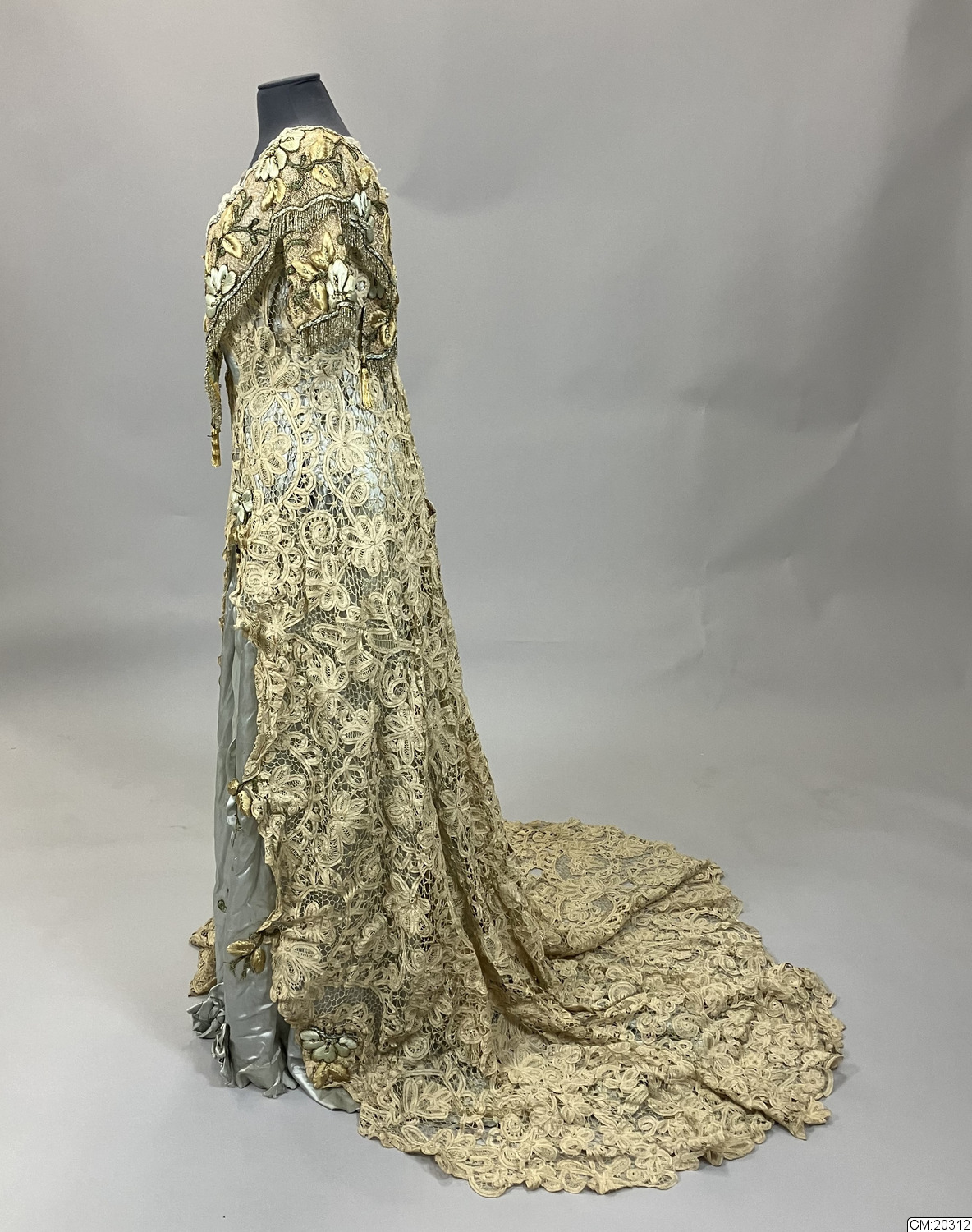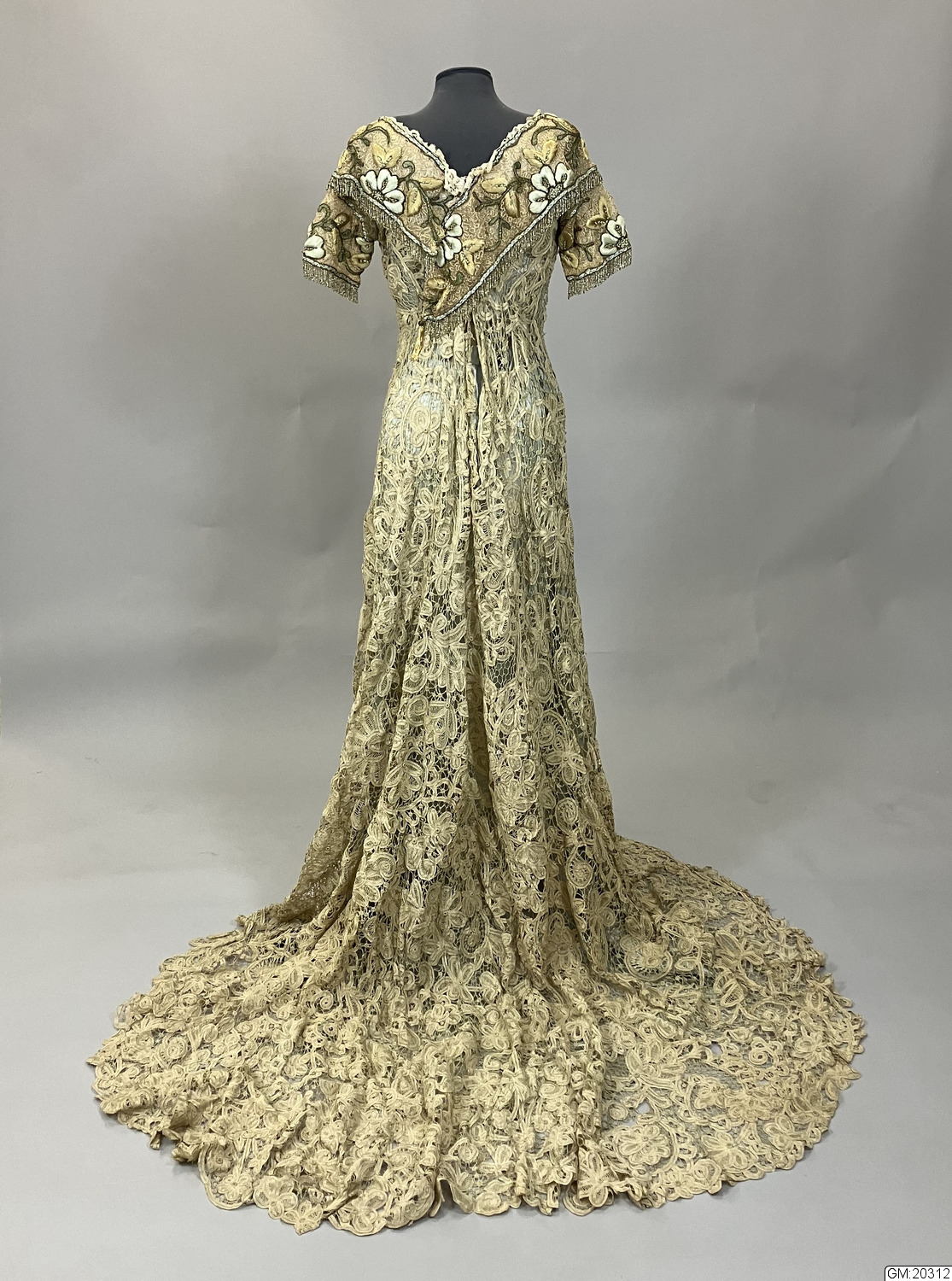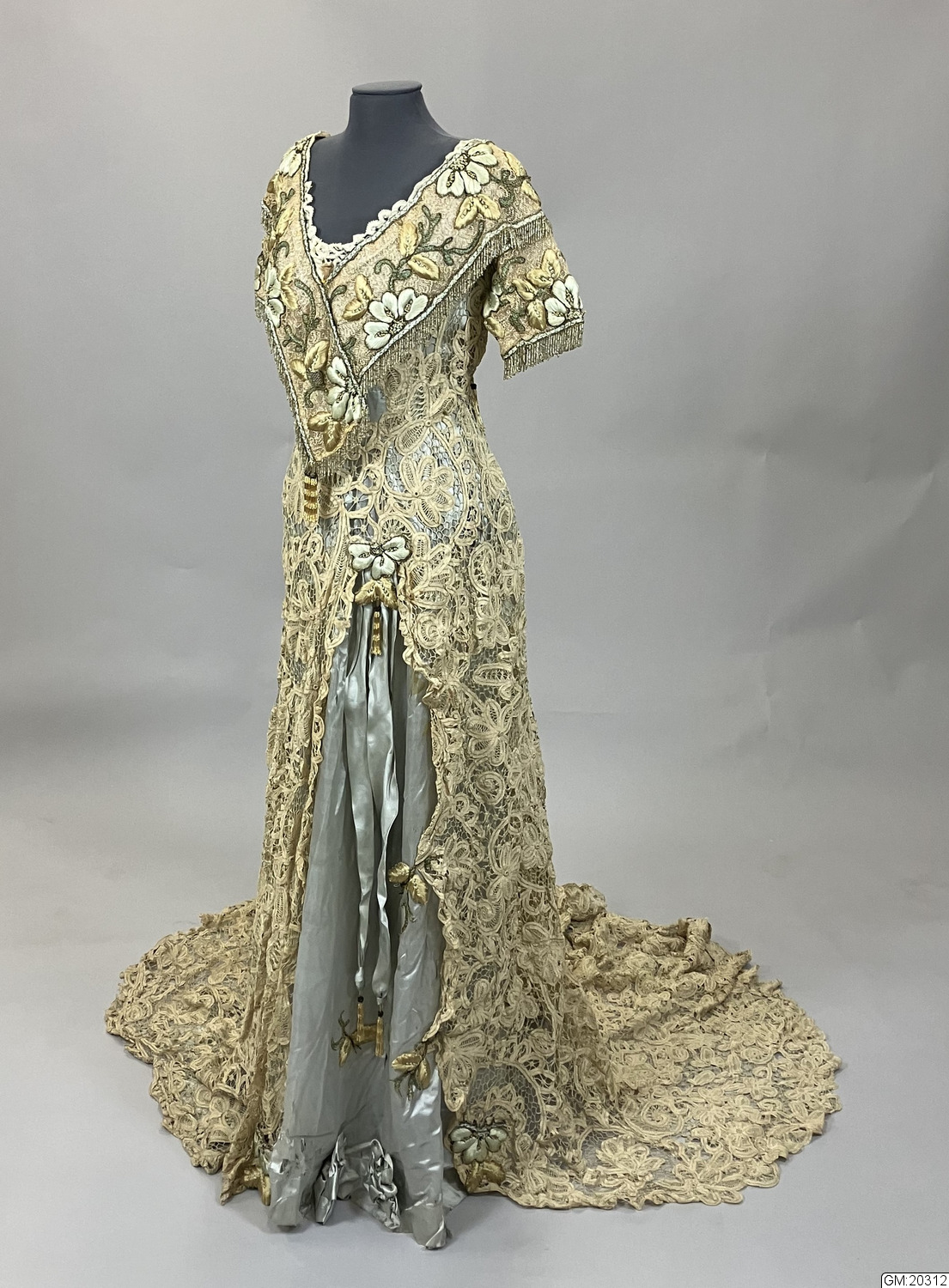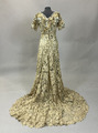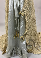 - Hellång aftonklänning i virkad spets med broderi och pärldekorationer. Klänningens liv är kortärmat, V-ringat med knäppning mitt bak med hyskor och hakar. Livet är korsetterat och fodrat med bomull. Bredare bårder med tredimensionellt broderade blommor med stjälkar och blad i silke och guldfärgad metalltråd längs med urringningen och bårderna överlappar varandra mitt fram och mitt bak. Samma bårder utgör även de korta ärmarna. Både urringning och ärmar avslsutas med frans av gula glaspärlor. Hellång kjol med långt släp i virkad spets som går upp i spets mitt fram och visar underkjolen i ljusgrönt siden som är broderad med blomor och insekter i samma teknik. Mitt fram hänger två långa sidenband som avslutas med tofs av pärlfrans.