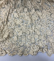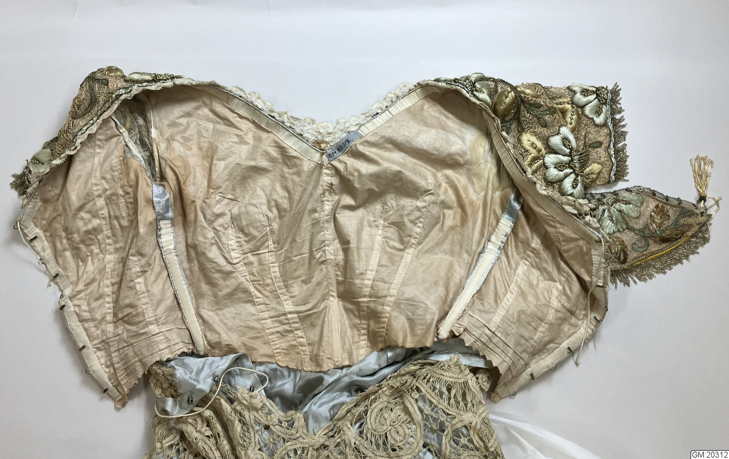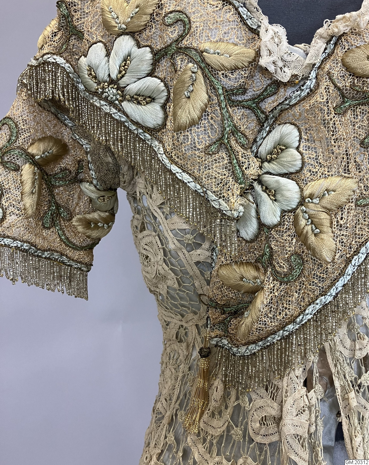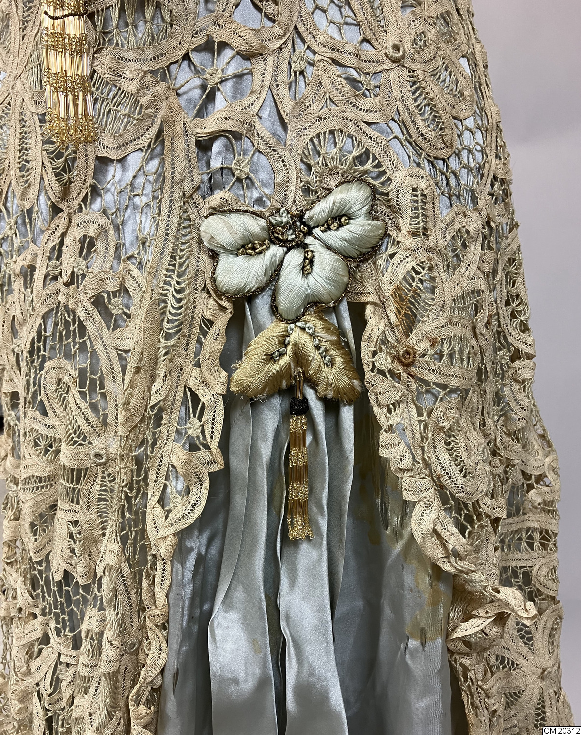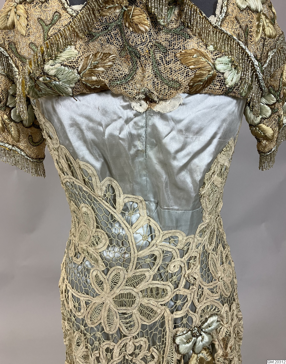 - Hellång aftonklänning i virkad spets med broderi och pärldekorationer. Klänningens liv är kortärmat, V-ringat med knäppning mitt bak med hyskor och hakar. Livet är korsetterat och fodrat med bomull. Bredare bårder med tredimensionellt broderade blommor med stjälkar och blad i silke och guldfärgad metalltråd längs med urringningen och bårderna överlappar varandra mitt fram och mitt bak. Samma bårder utgör även de korta ärmarna. Både urringning och ärmar avslsutas med frans av gula glaspärlor. Hellång kjol med långt släp i virkad spets som går upp i spets mitt fram och visar underkjolen i ljusgrönt siden som är broderad med blomor och insekter i samma teknik. Mitt fram hänger två långa sidenband som avslutas med tofs av pärlfrans.