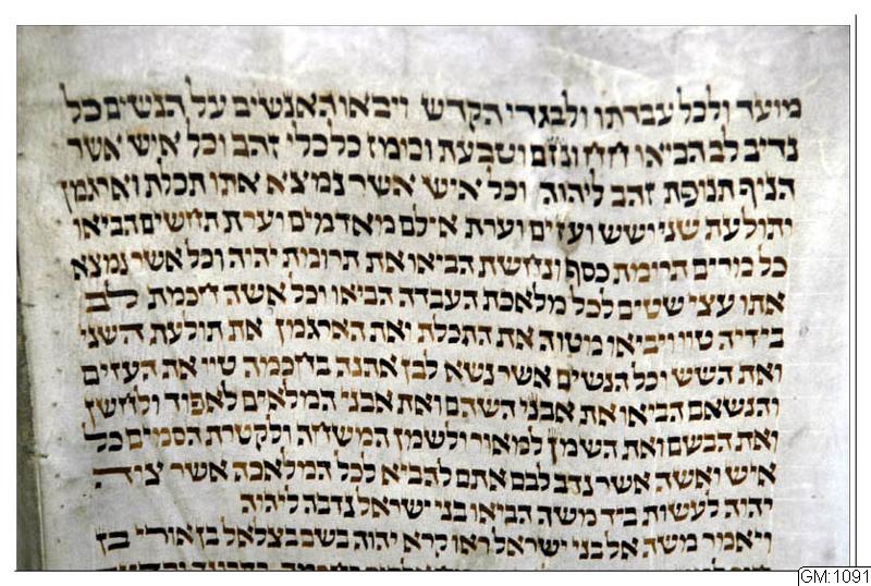 Torarulle, de fem moseböckerna skrivna på hebreiska. Torarullarna är skrivna på pergament. De är synagogans förnämsta kultföremål. Inför dem har de fromma judarna samma vördnad, som katolikerna inför helgonbilder och reliker. Pergamentarken är hopfogade till ett enda, som är fästat vid två trästavar. Kring dessa rullas pergamentet. Vid varje sabbatsgudstjänst läses ett eller två avsnitt ur Toran som är indelade i femtiofyra avsnitt. Vissa stycken läses på festdagar samt alla måndagar och torsdagar. Torarullarna är skrivna med opunkterad hebreisk kvadratskrift utan vokaler eller skiljetecken. Läsningen är melodiskt reciterande. I arken förvaras de omlindade och överklädda med broderade kåpor av siden eller sammet. På dessa kåpor är med slivertrådar broderad en hebreisk text. Trästavarnas övre ändar är smyckade med kronor av silver (gäller ej GM:1091), vid vilka ofta små klockor finns. Klockorna tjänar att dra församlingens uppmärksamhet till sig, när den heliga texten skall läsas. Man antar, att klockorna på Torakronan har att göra med de bjällror av guld, som översteprästen Aron enligt andra Mosebokens 28:e kapitel bar på sin dräkt. Mellan granatäpplen, gjorda av mörkblått, purpurrött och rosenrött garn, skulle hans dräkt längs kåpans fåll ha bjällror av guld. Och denna kåpa - så lyder föreskriften - "skall Aron hava på sig, när han gör tjänst, så att det höres, när han går in i helgedomen inför Herrens ansikte och när han går ut."