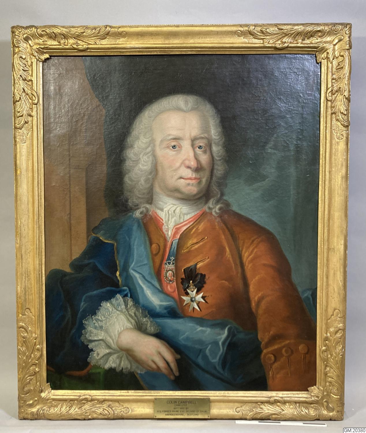 Colin Campbell bär Nordstjärneordens riddartecken som han hade fått 1753. På porträttet bär han även ett krönt, briljantinramat miniatyrporträtt av Fredrik I, som denne lär ha förärat honom efter den första resan till Kina 1732-33 (för vilken han själv var förste superkarg).