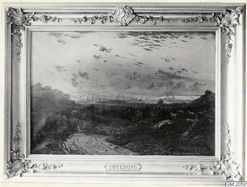 Utsikt över Göteborg från Landalabergen år 1860. I fonden Göteborg, med tornen från Tyska kyrkan och Domkyrkan till höge, man ser även Sahlgrenska sjukhuset. På Otterhällen ståtar Arsenalen och nedanför den på andra sidan vallgraven, Hagakykran.
