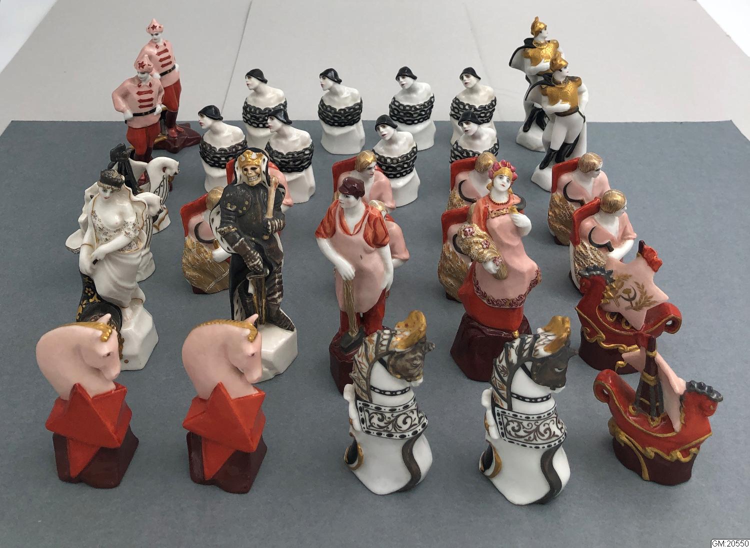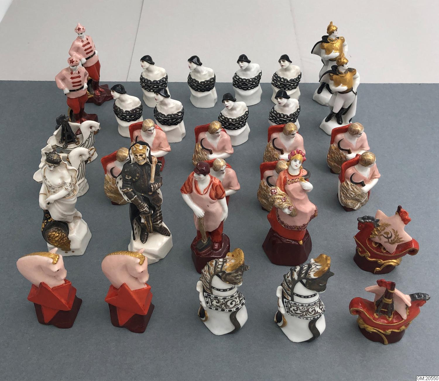 32 pjäser med motiv inspirerat av ryska revolutionen, kapitalismen möter kommunismen över ett schackparti. Spelet tillverkades vid den statliga porslinsfabriken nära Leningrad, som tidigare var den kejserliga porslinsfabriken, St. Petersburg senare "Petrograd.".
