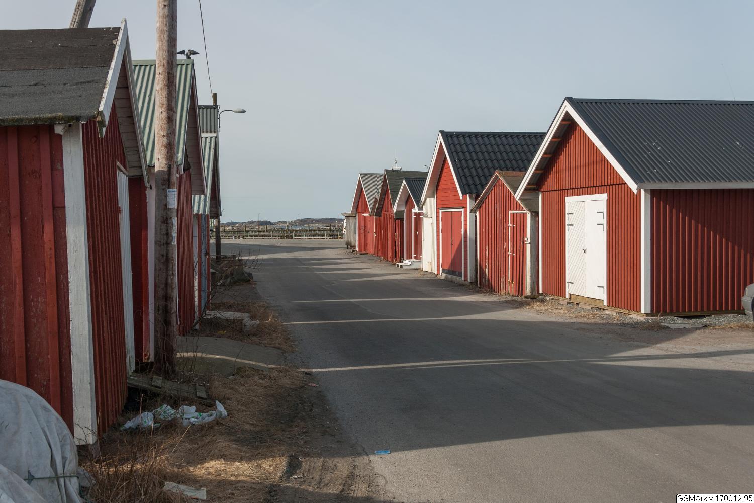 fiskehamn. Bodarna utgör två rader av små trähus som