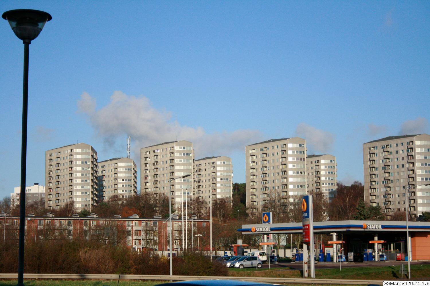 i form av punkthus. När stadsdelen byggts färdigt med bostäder kompletterades den med centrumanläggningar och gymnasieskola. Spårvägen byggdes ut till Frölunda 1964 och Säröbanan lades ner året efter.