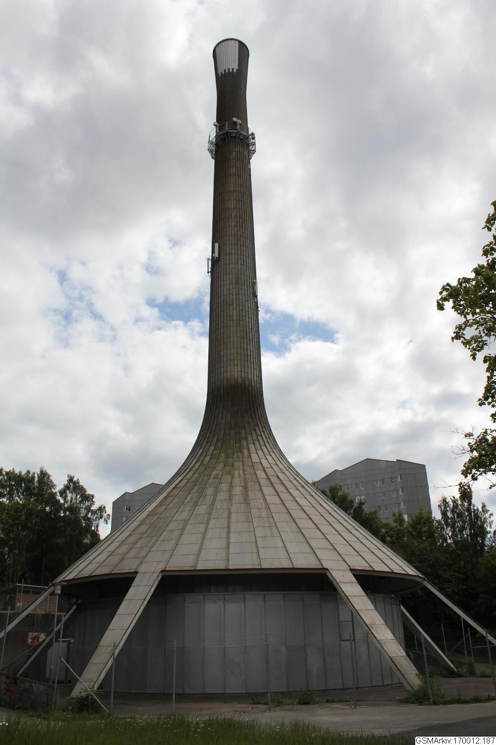 vid tiden för uppförandet ett nytt ”underhållsfritt” material, en ”regnkappa” i väderutsatt läge. En del av lägenhetsplanlösningarna är flexibla. ”Tratten” panncentral Panncentralen ”Tratten” ligger vid Marconigatan nära Frölunda Torg. Byggnaden har en säregen, skulptural form likt en upp- och nedvänd tratt. Konstruktionen består av ett aluminiumskal trätt över en platsmurad tegelskorsten.