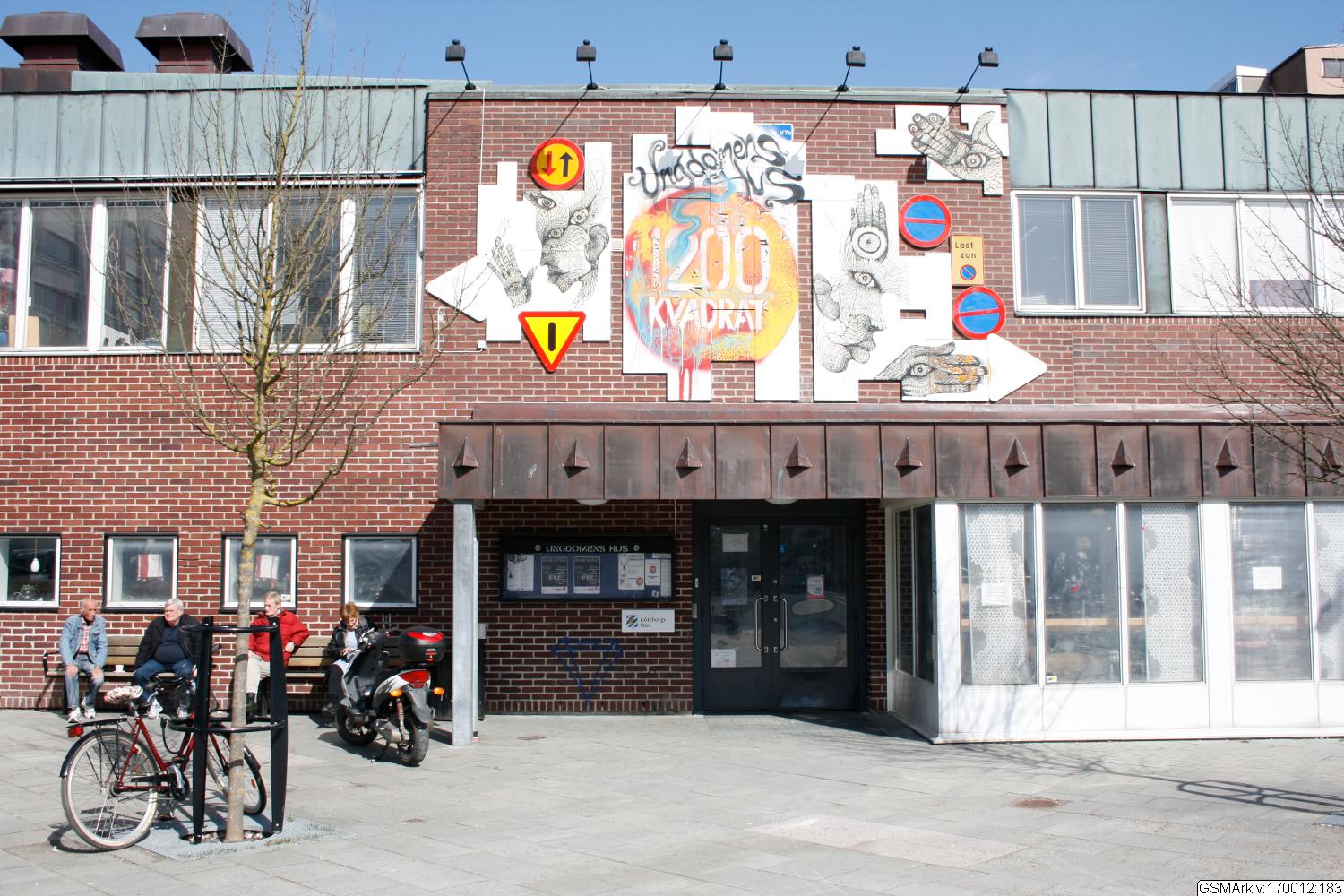 nerifrån spårvagnshållplatsen. Byggnaden är byggd i mörkt tegel och klinker med stora glasytor mot den omgivande naturen, i de publika delarna. Många olika verksamheter i huset innebär att människor i alla åldrar möts i den gemensamma entréhallen/inomhusgatan med ursprunglig konstnärlig utsmyckning av konstnären Lennart Landqvist.