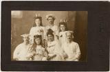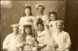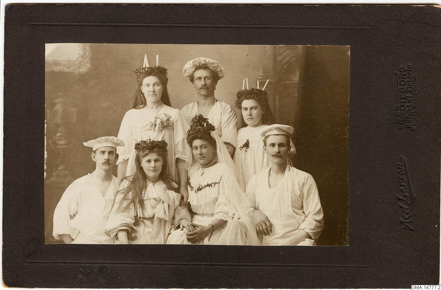Altejefoto med Luciatåg, 4 kvinnor med ljuskronor och 3 män ibagarkläder.