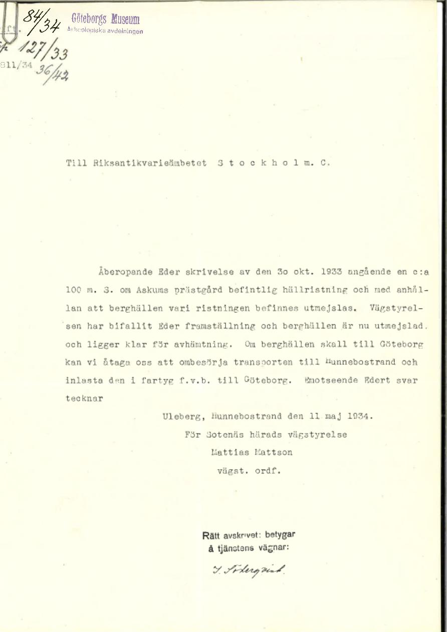 Brev från Mattias Mattson ordförande för Sotenäs härads vägstyrelse 1934 till Riksantikvarieämbetet