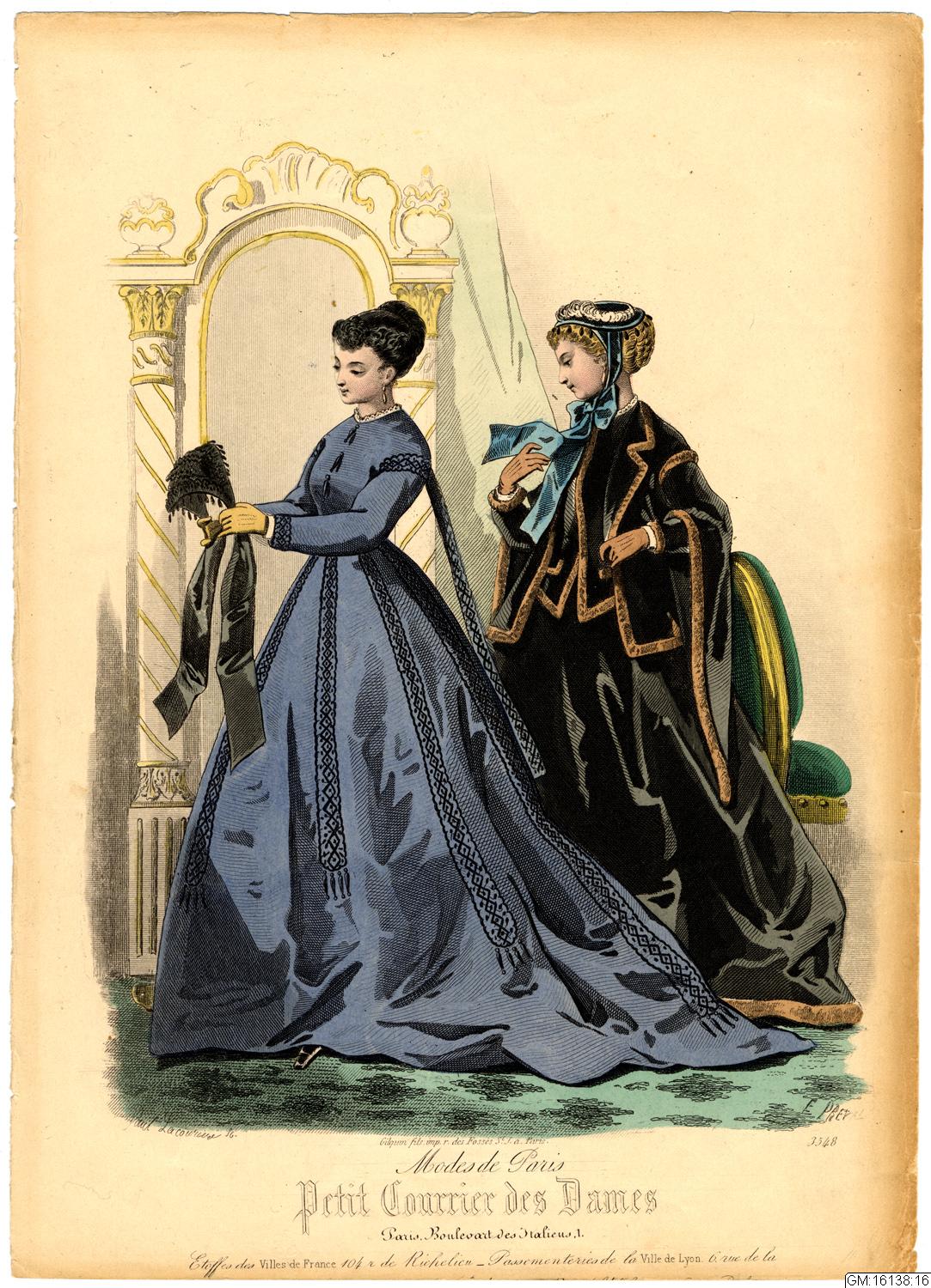 - lös modeplansch ur Göteborgs Stadsmuseums arkiv bilden visar två stående kvinnor, en i blåviolett klänning med svarta dekorer och liten vit halskant , den andra i svart promenadklädsel med bruna pälsbräm samt en blå hatt med hakrosett och vit plym .