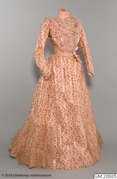 "Klänning. Av rosa siden med rosenknoppar och vita ränder på längden. Består av två liv och kjol. Liv I: V-ringning, knäppes med hakar och hyskor framtill och har halv-långa ärmar samt fichu lagd omlott framtill, av rosa chiffon. Liv II: hög i halsen, infällt fram- och bakparti av tyll och paljetter kantat av rosa chiffon. Långa ärmar samt rosa sidenskärp med rosett. Kjol: vid, utsvängd i ena sidan, kantad nertill av en bred volang i rosa chiffon.
