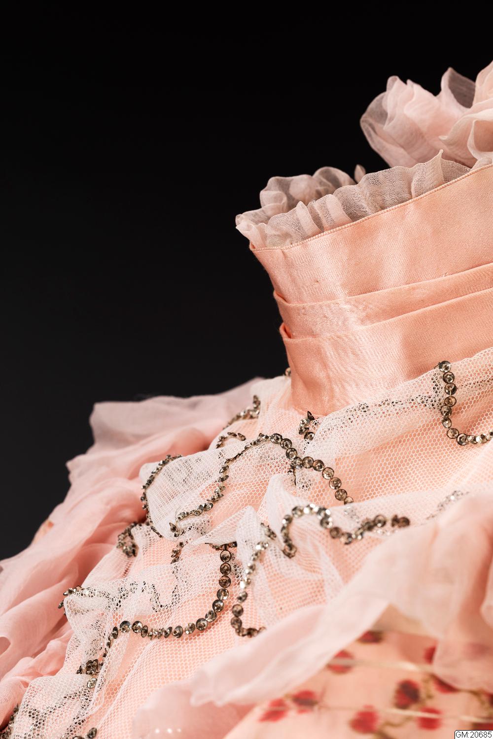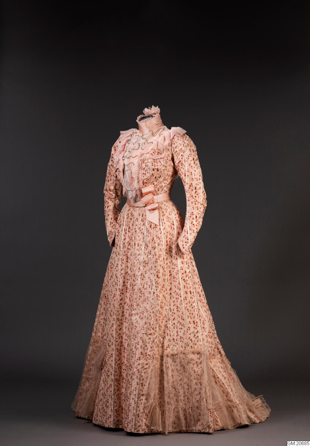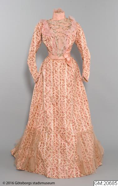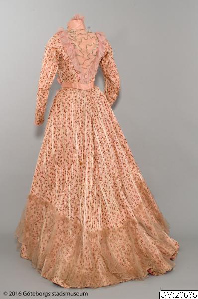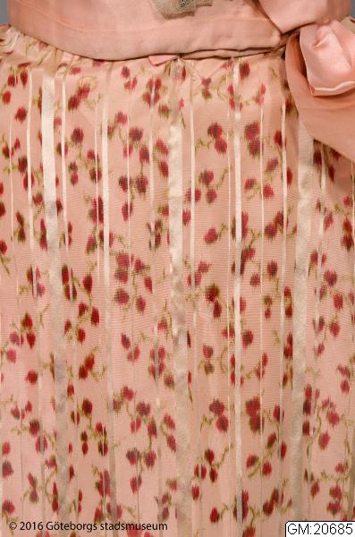 Rosa klänning bestående av kjol och två olika liv i rosa siden med rosenmönster och volanger i chiffong. Livet med lång ärm har ett märkband i midjan från Augusta Lundins ateljé, Stockholm medan livet för aftonbruk har ett märkband i midjan från Henrik Ahlbergs modemagasin, Göteborg.