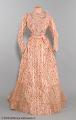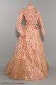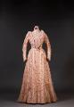Rosa klänning bestående av kjol och två olika liv i rosa siden med rosenmönster och volanger i chiffong. Livet med lång ärm har ett märkband i midjan från Augusta Lundins ateljé, Stockholm medan livet för aftonbruk har ett märkband i midjan från Henrik Ahlbergs modemagasin, Göteborg.