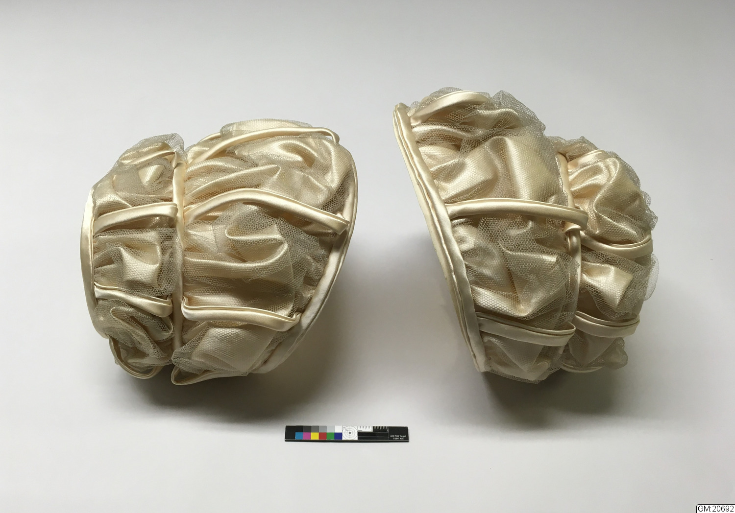Ett par ärmar som tillhört en hovdräkt för kvinnor. Ärmarna är i vitt siden med galler i vitt.