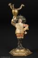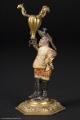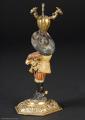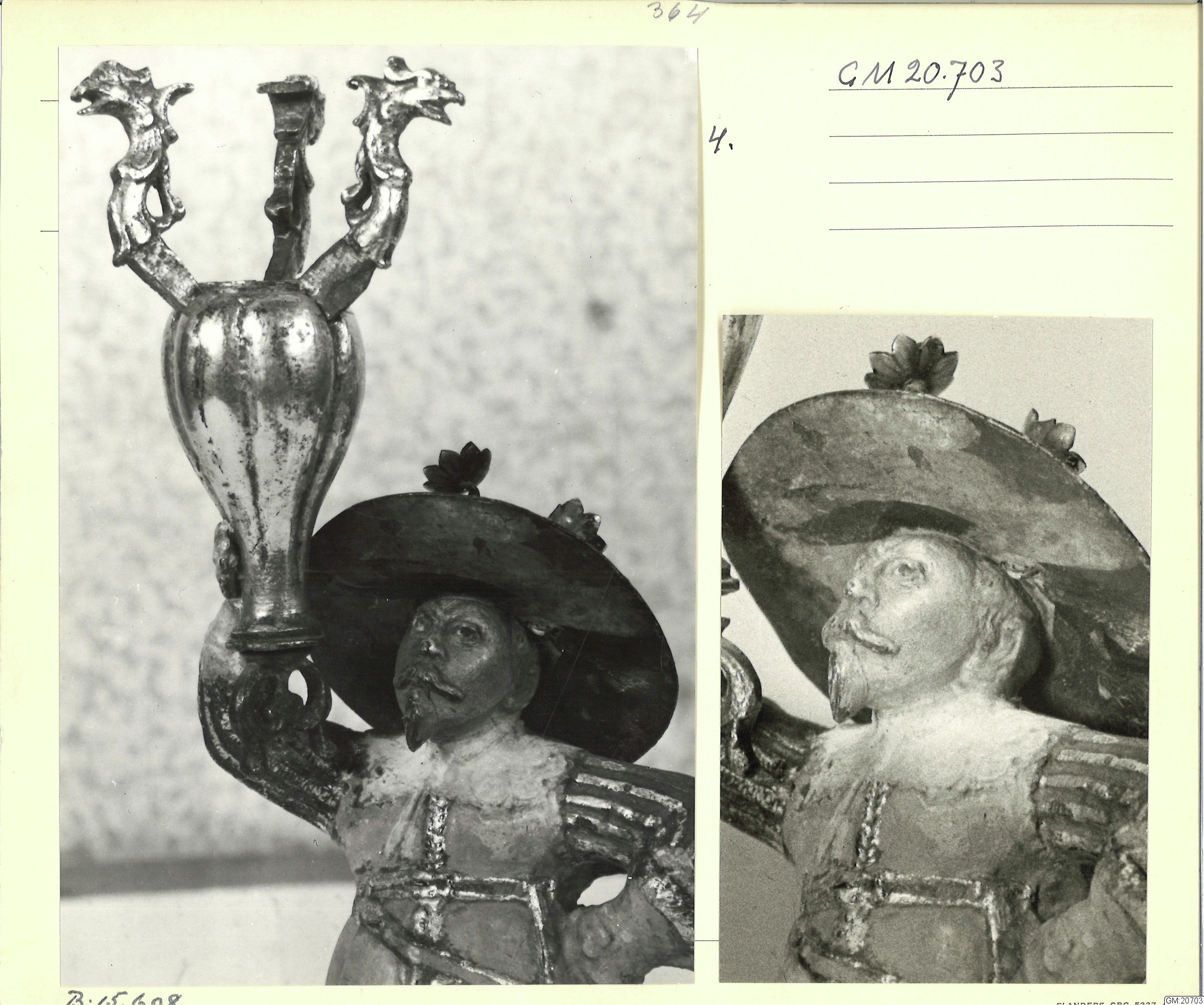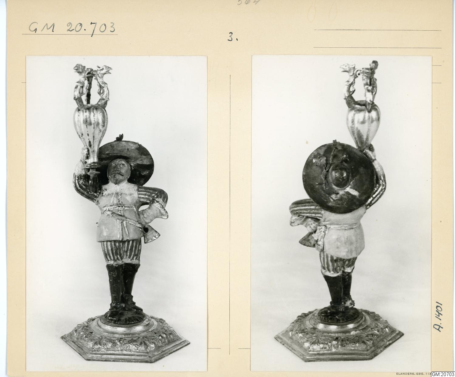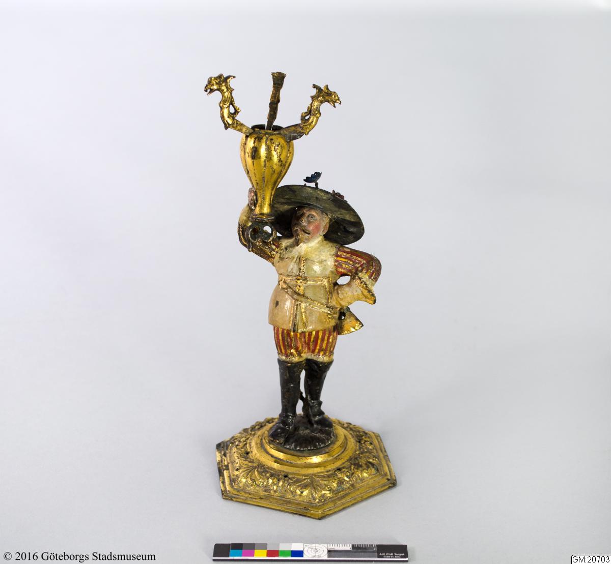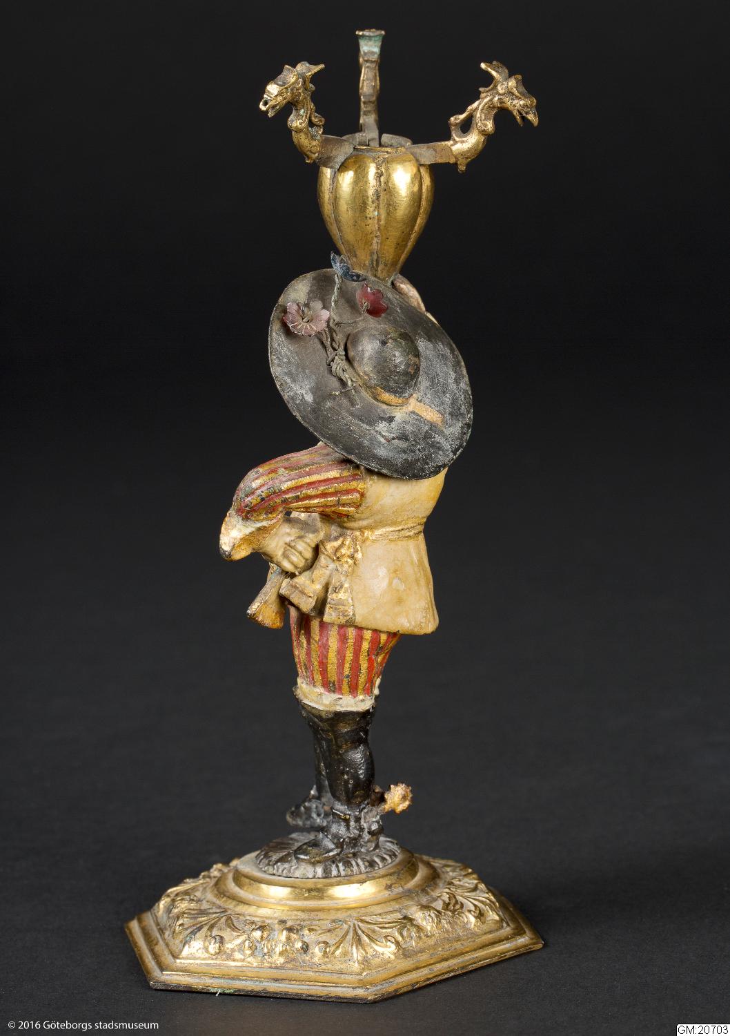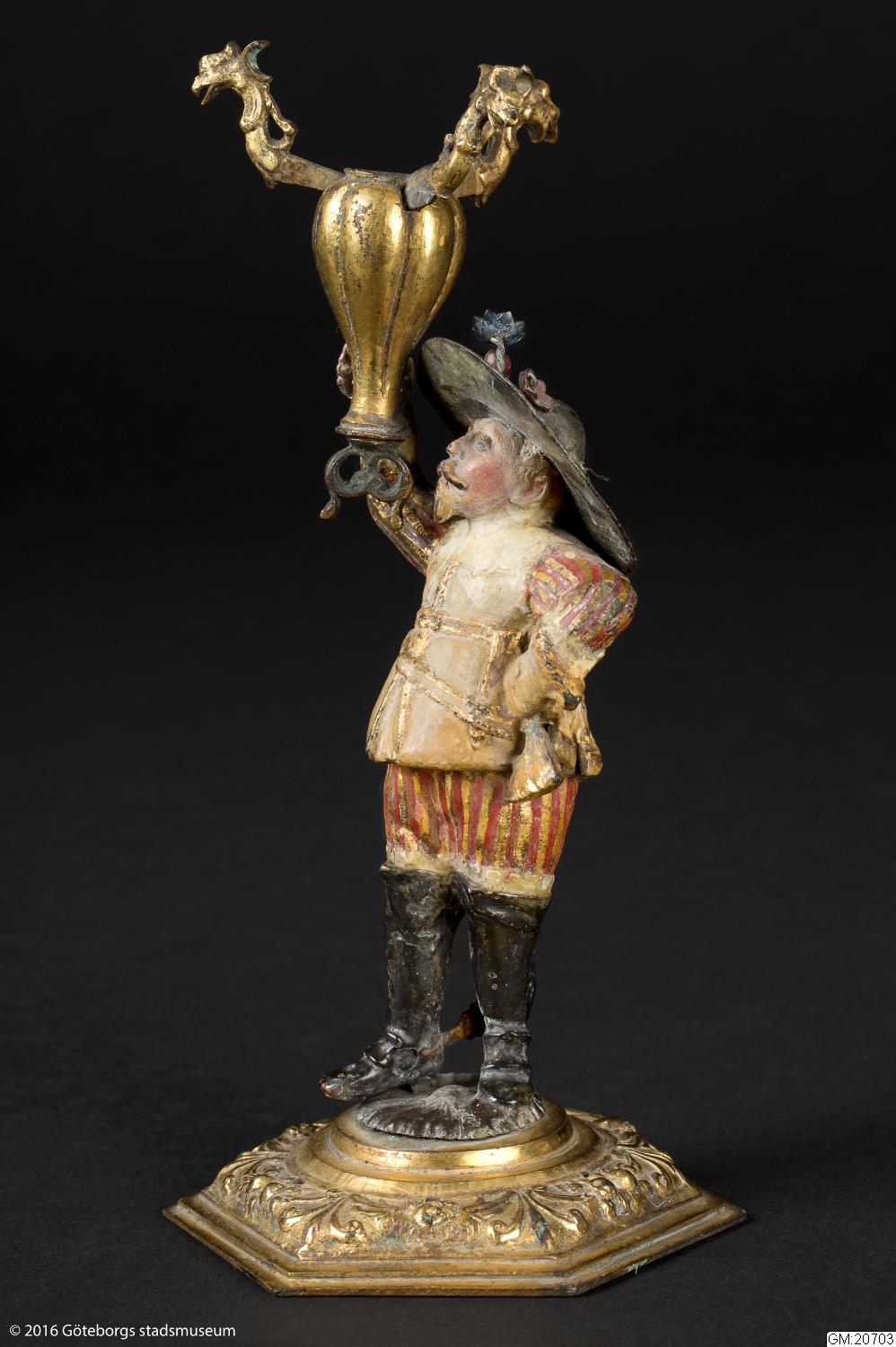 Statyeller eller glashållare av det här slaget tillverkades i samband med det tyska eller trettioåriga kriget , ca1630-talet, som sympatibevis och eller propagandaföremål, de tillverkades ofta i förnäma material och med stor hantverksskicklighet, detta exemplar har sitt ursprungliga glas i behåll vilket är ovanligt, vanligen ser man dessa statyetter med en vanlig sk remmare (vinglas i vanligen grönaktig glasmassa med en speciell form och konformad fot) i klon i kungens hand.