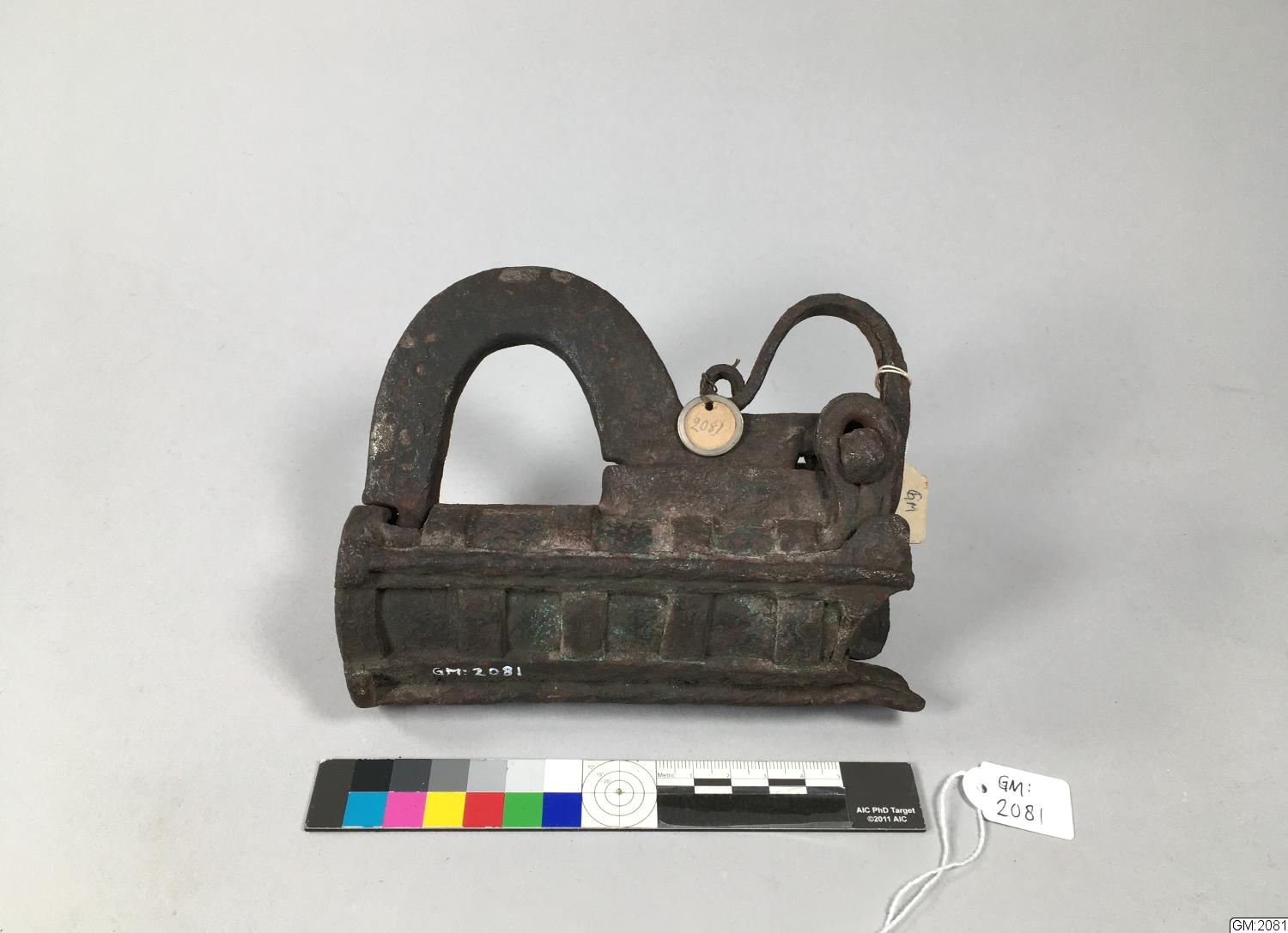 "Bultlås af järn, dat. 1654; funnit älfven utanför Vilhelmsbergs mek. verkstad"