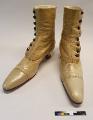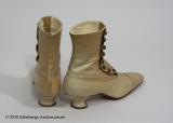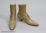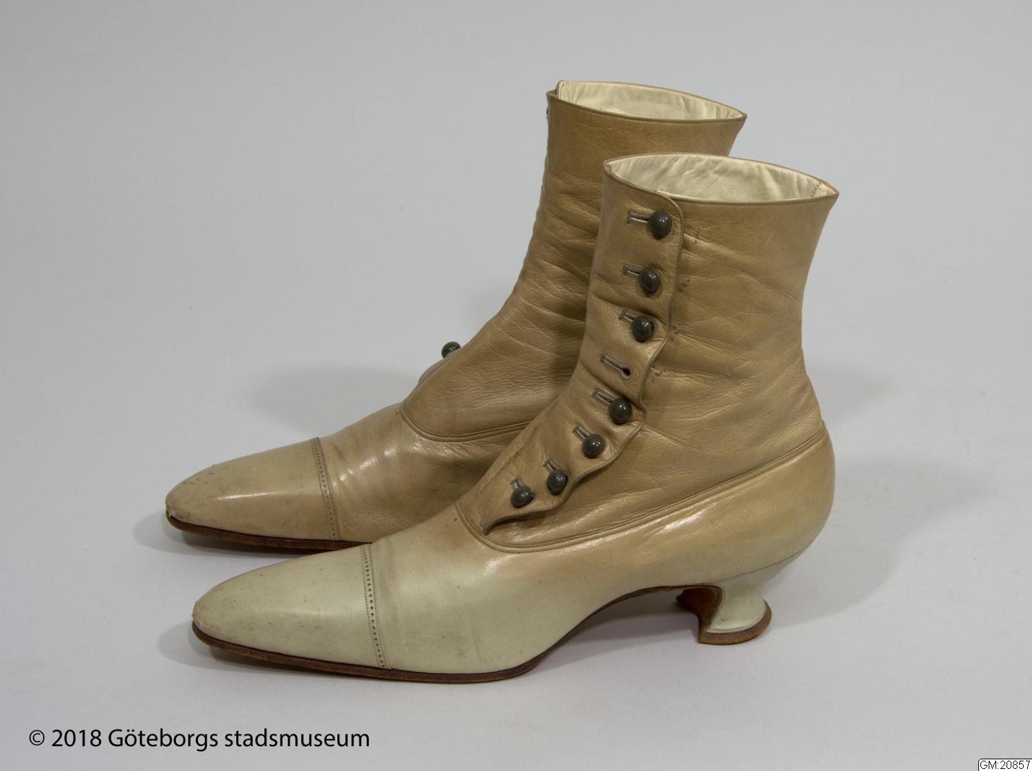 Knäppkängor, ett par för dam, av beige chevreau, fodrade med vit lärft och kantade på insidan av skaftet med vitt skinn. 4,5 cm hög klack. Knäppning med 8 stycken gråa knappar och knapphål (en knapp saknas).