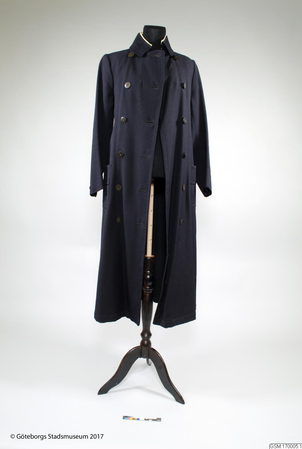 - Barnsköterskeuniform, sydd 1936,( kappan av Skrädderi Emil Blomqvist Göteborg), betående av kappa av diagonalvävt mörkblått ylle, sköterskebrosch av silver från Gullbergsbrohemmet där utbildningen genomfördes, manschetter och kragar av vit bomull, ett par vita underbyxor av bomull, ett förkläde av bomull samt en kjol av blått bomullstyg.