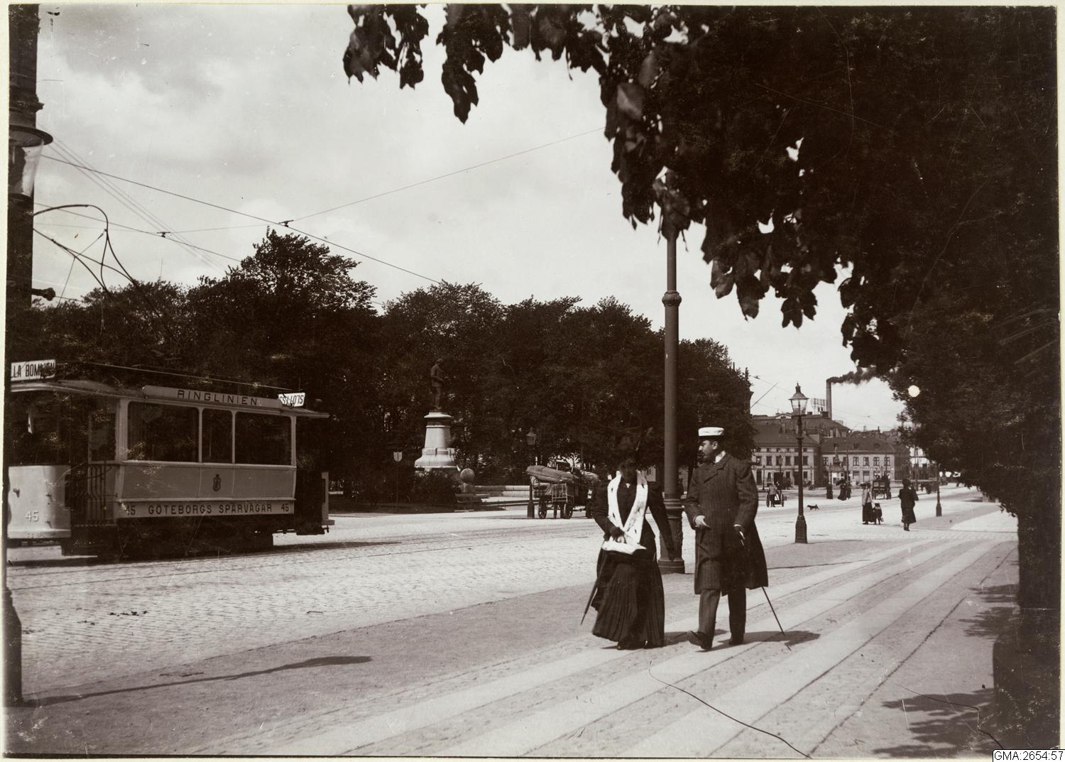 - Sträckningsbild Kungsportsavenyn norrut. I korsningen med Nya Allén anas Ingel Fallstedts staty av John Ericsson. Bilden tagen i höjd med Storgatan.