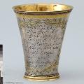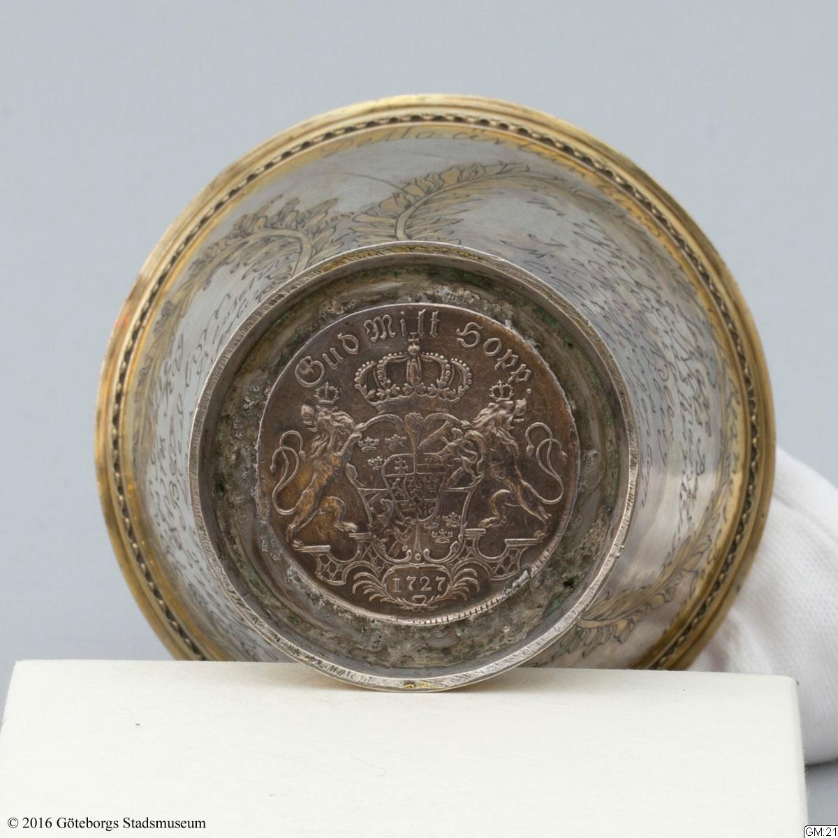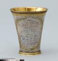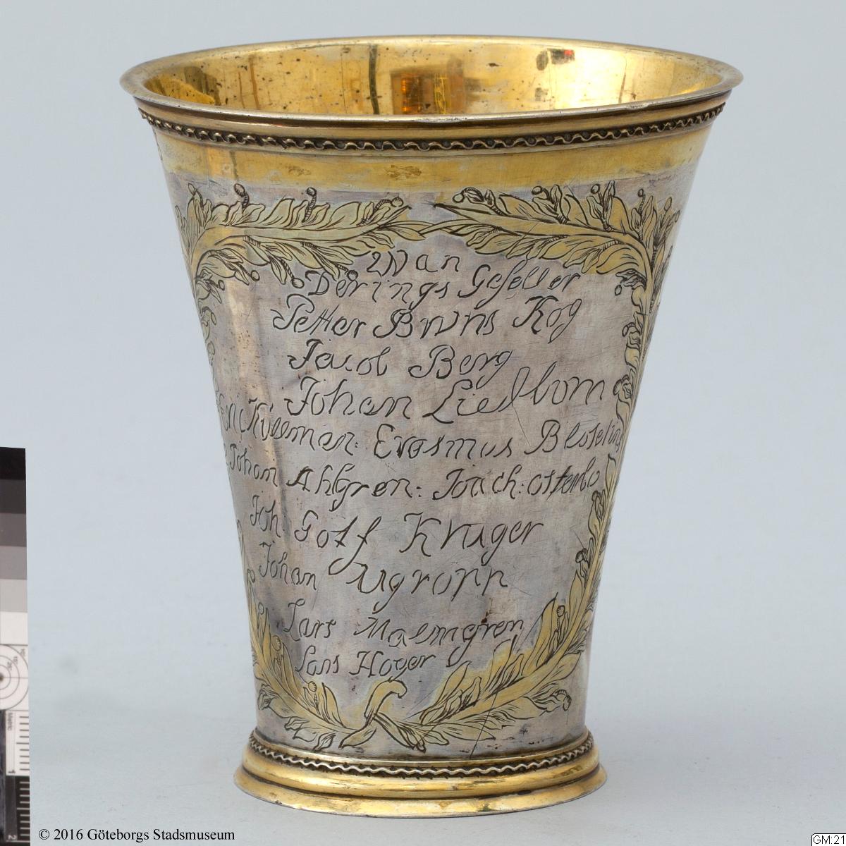 Tunnbindaregesällskapets i Göteborg bägare, 1763. Bägare av silver delvis förgylld, klassisistisk stil, undermynningskanten graverat: "Detta är tunbindare Gesellernas Begare Ao 1763."