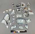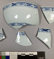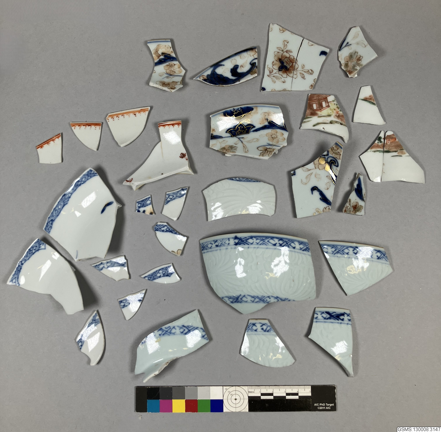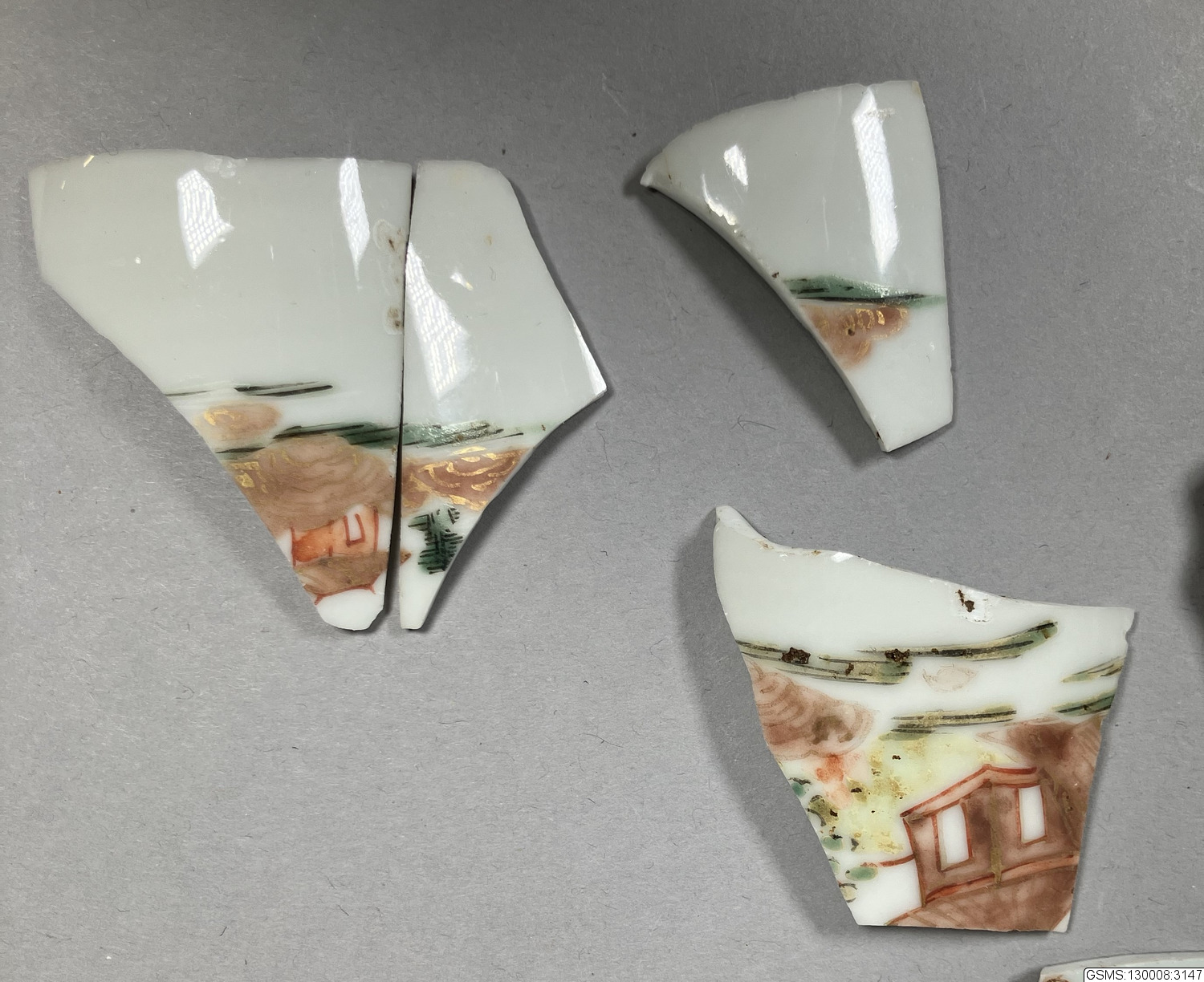 Ostindiskt porslin, fragment från olika fat och koppar. En skål med anhua-dekor