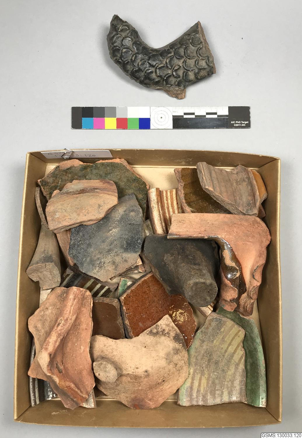 Glaserat rödgods, fragment; skärvor av blandade kärl. En bit formkakel som antagligen är en bit av en fisk eller en drake