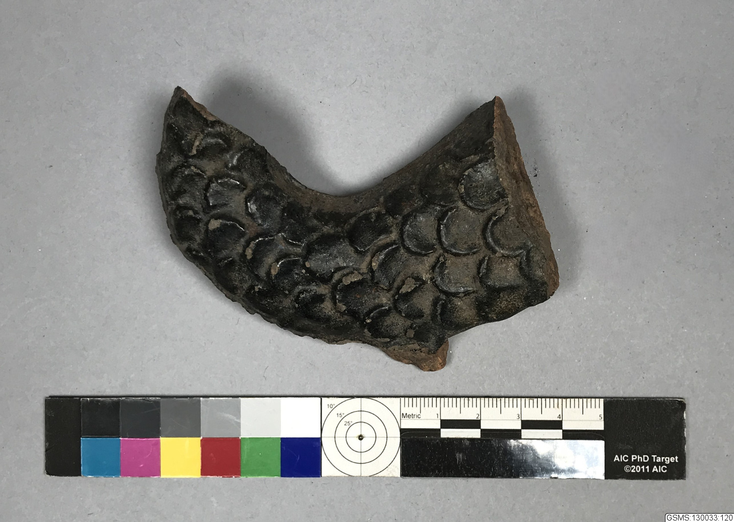 skärvor av blandade kärl. En bit formkakel som antagligen är en bit av en fisk eller en drake