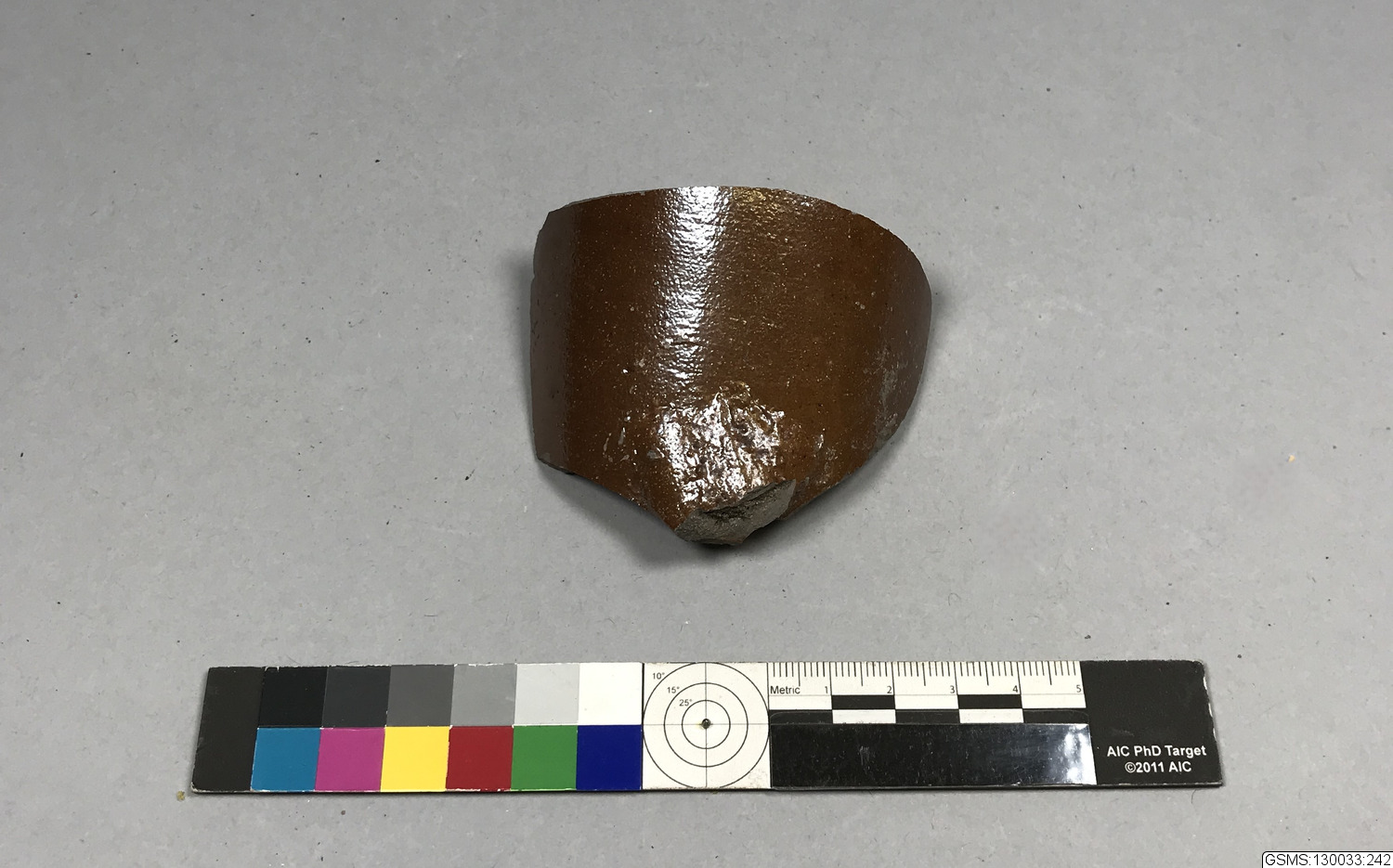 Brunglaserat stengods, fragment; en brun skärva från flaska