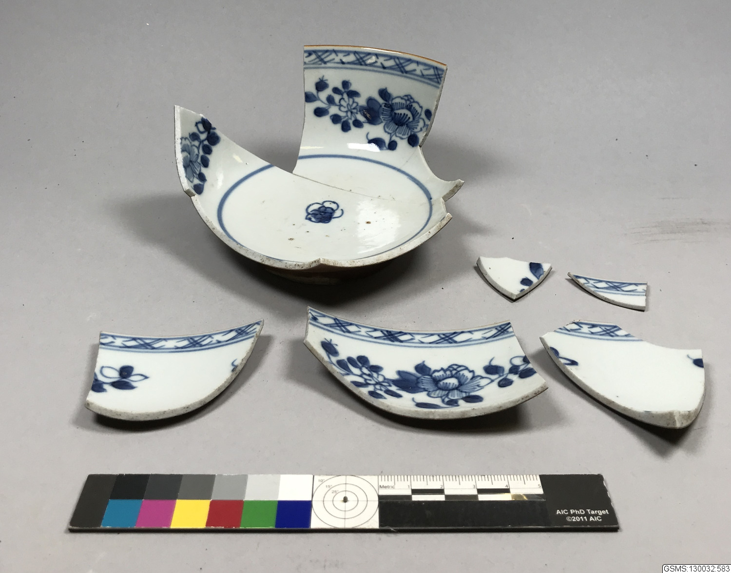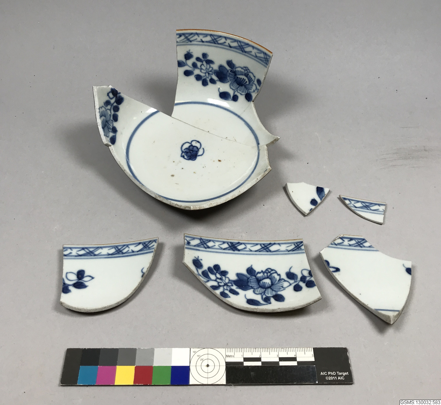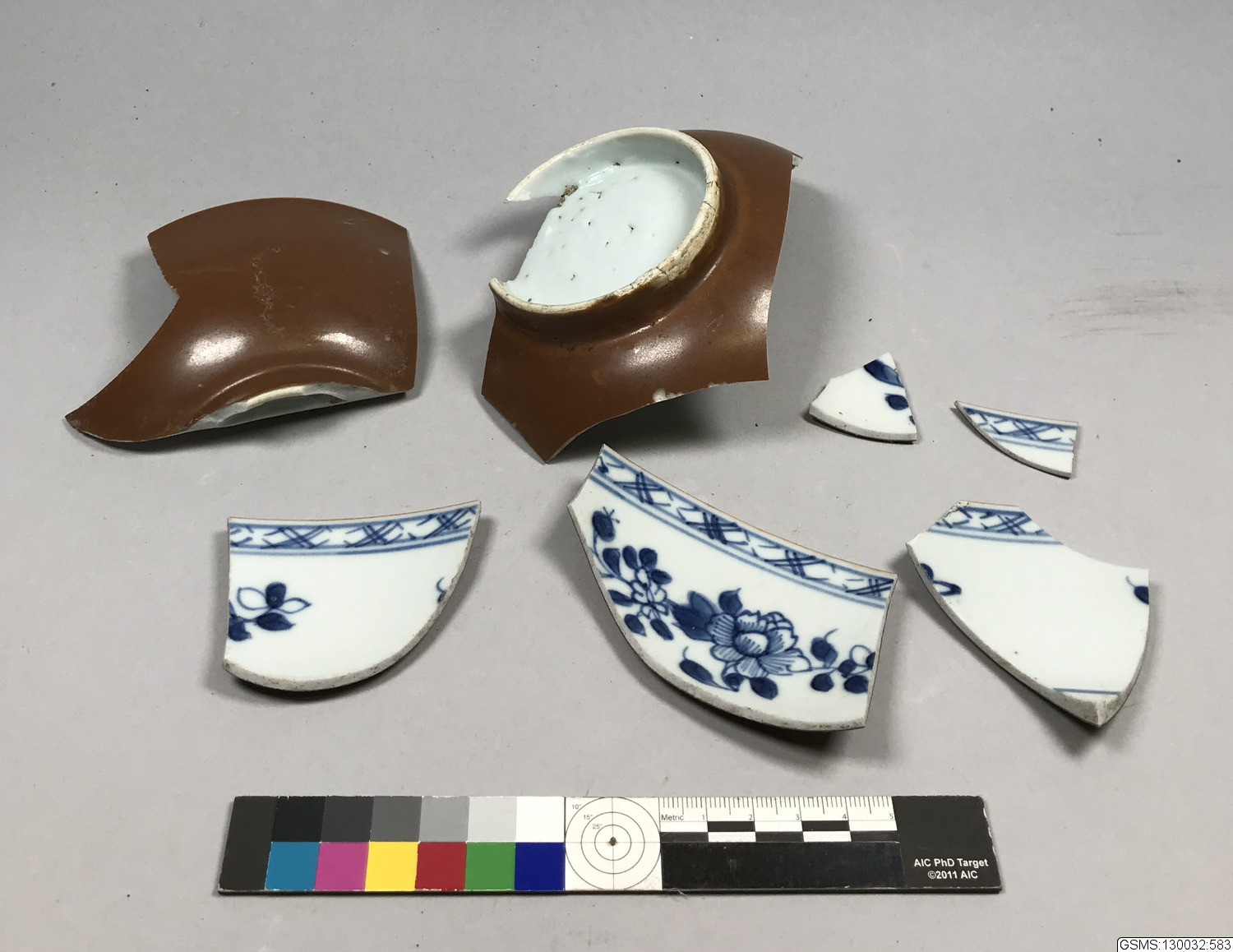 Ostindiskt porslin, fragment; ostindisk skål med blå blomdekor, brun utsida