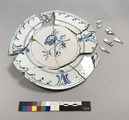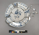 Blåvit fajans, fatfragment; tallrik med blå dekor. Samma dekor som GSMS:130032:574