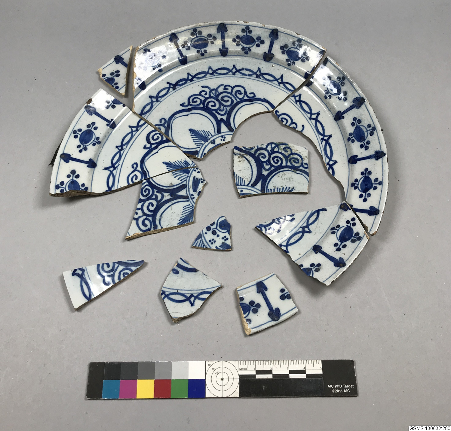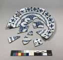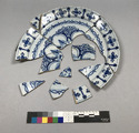 Blåvitt fajansfat, fragment; skärvor av en tallrik med blå dekor