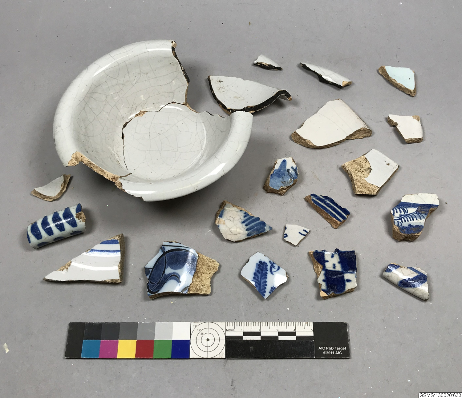 Fajans, fragment; fajans och majolika, bland annat en helvit skål