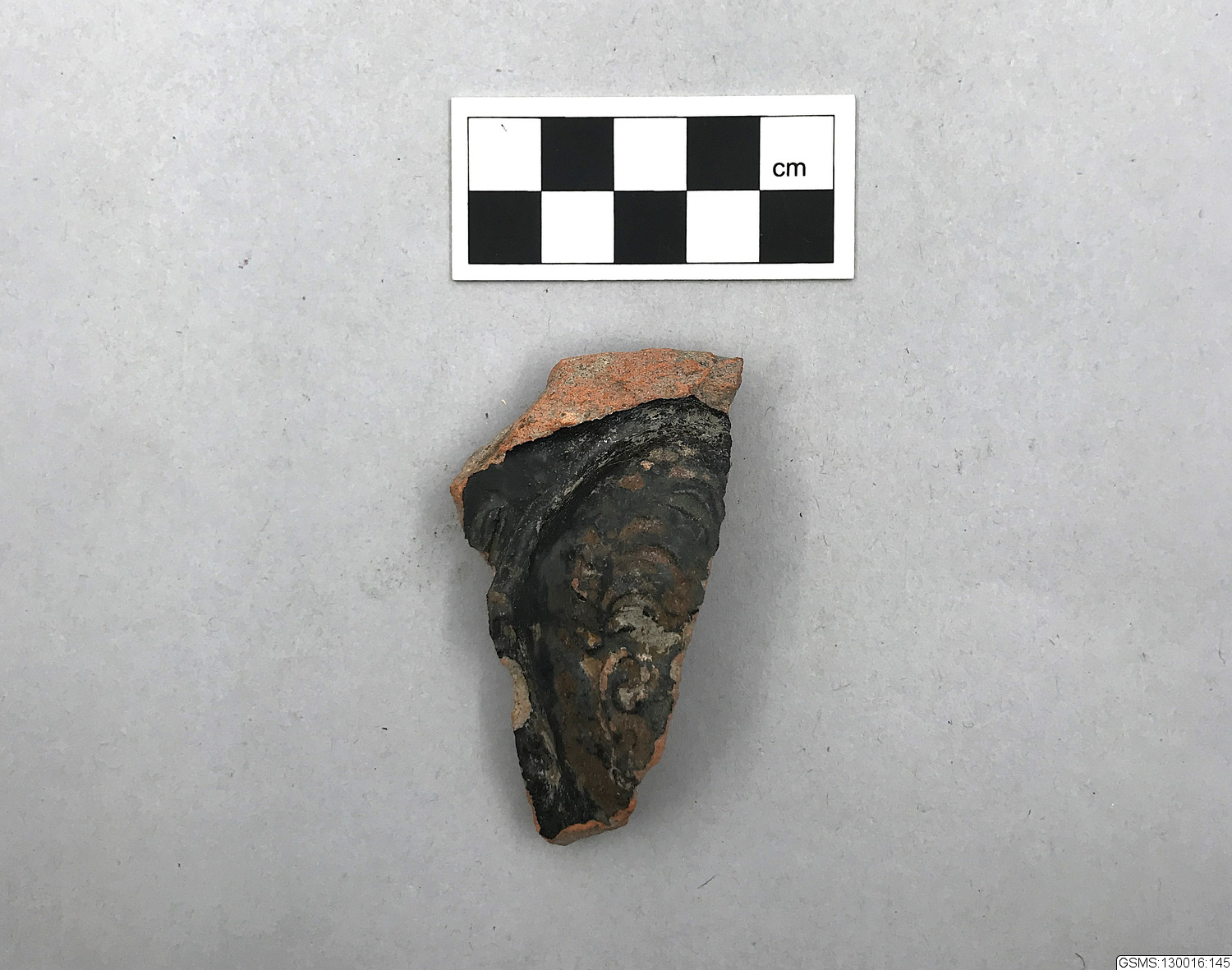 Glaserad kakel, fragment; en bit svartglaserat kakelugnskakel