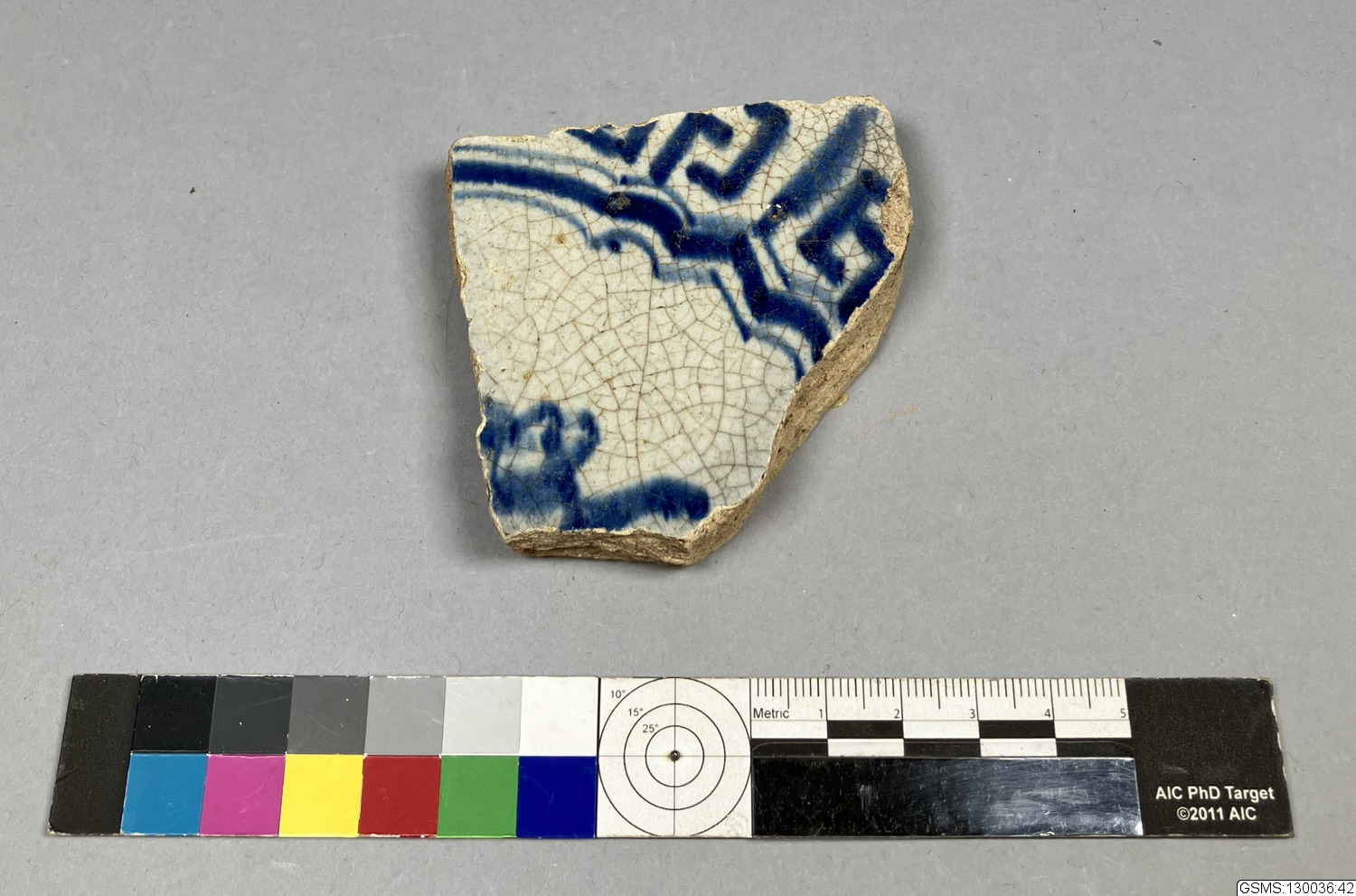 - en skärva av en kakel- eller klinkerplatta med vit och blå dekor