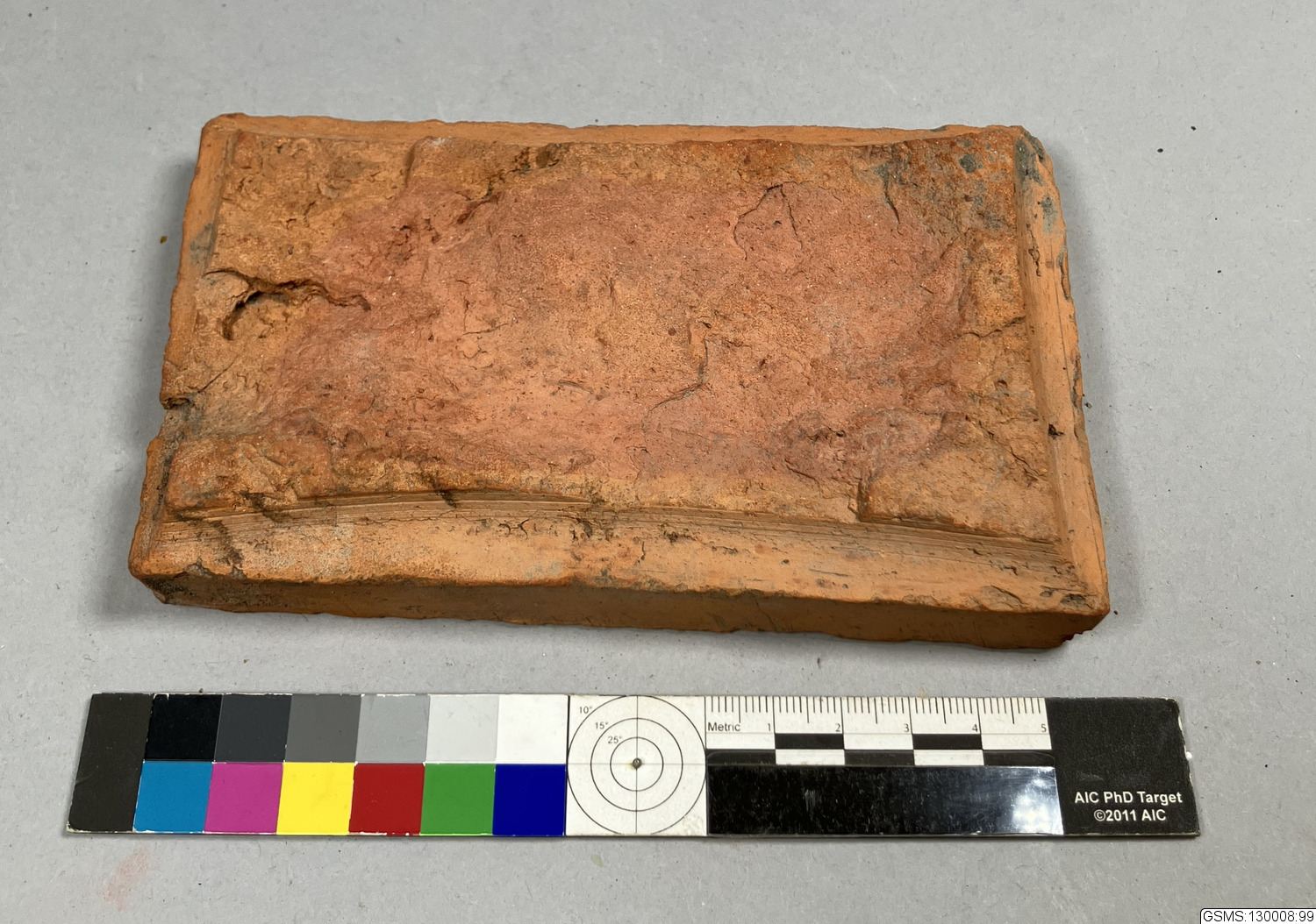 Kakel, fragment; troligen undersida mönstrad + 1 mönstrad del